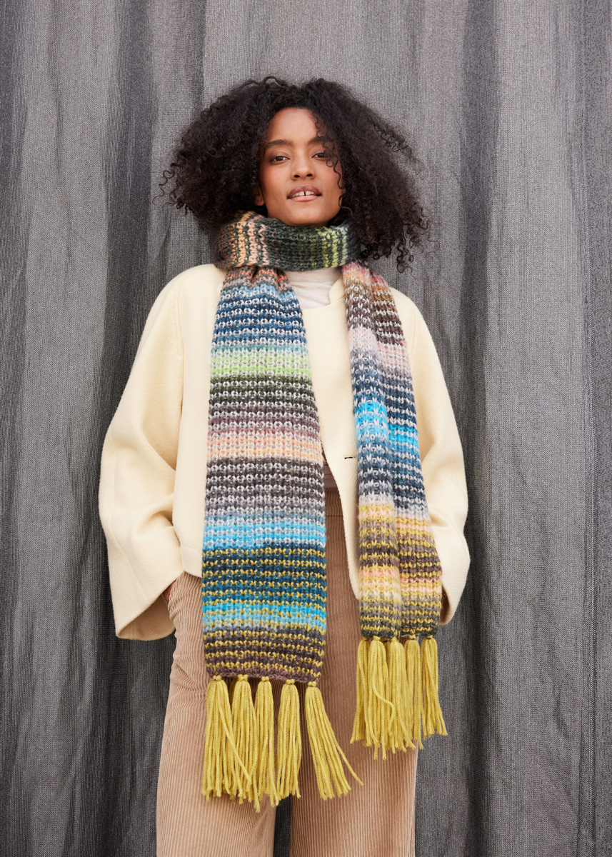 Garn von Lana Grossa, Qualität „Bomba“ (85% Schurwolle (Merino extrafine), 15% Polyamid, LL 290 m/100 g): 100 g (1 Knäuel) in Fb. 7 (Pfirsich/Weiß-/Hell-/Dunkelgrün/ Graupetrol/-braun/Türkisblau); „Cool Merino“ (90% Schurwolle (Merino), 10% Polyamid, LL 150 m/50 g): Je 50 g in Fb. 19 (Grün) in Fb. 33 (Gelb) 50 g und in Fb. 13 (Hellgrau)