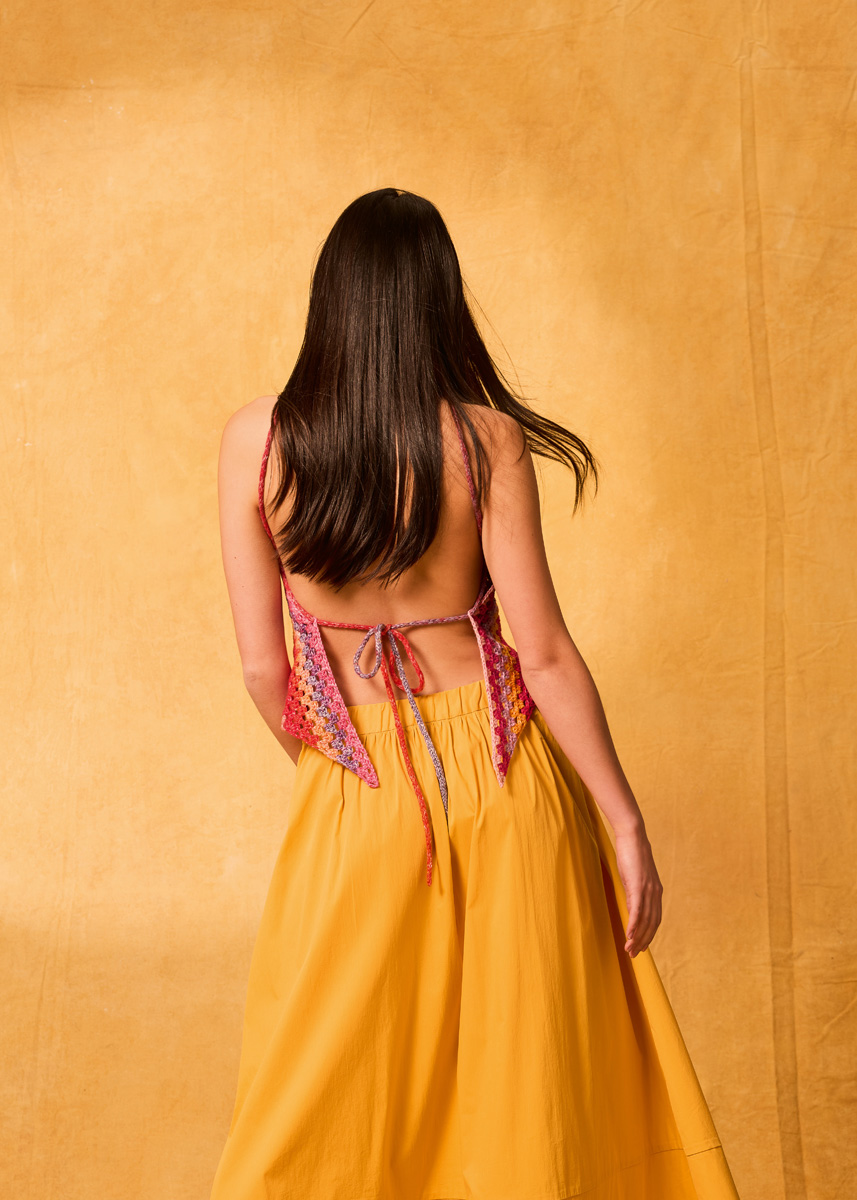 Lana Grossa-Qualität „Cotonella“ (100 % Baumwolle (Pima), LL = ca 280 m/100 g): ca 1 Knäuel = ca 100 g Camel/Pink/Fuchsia/Rotviolett/Grau/Flieder/Gelborange/Rot/ Gelb (Fb 19); 1 Häkelnadel 4,5; 2 Sockennadeln Nr 4.