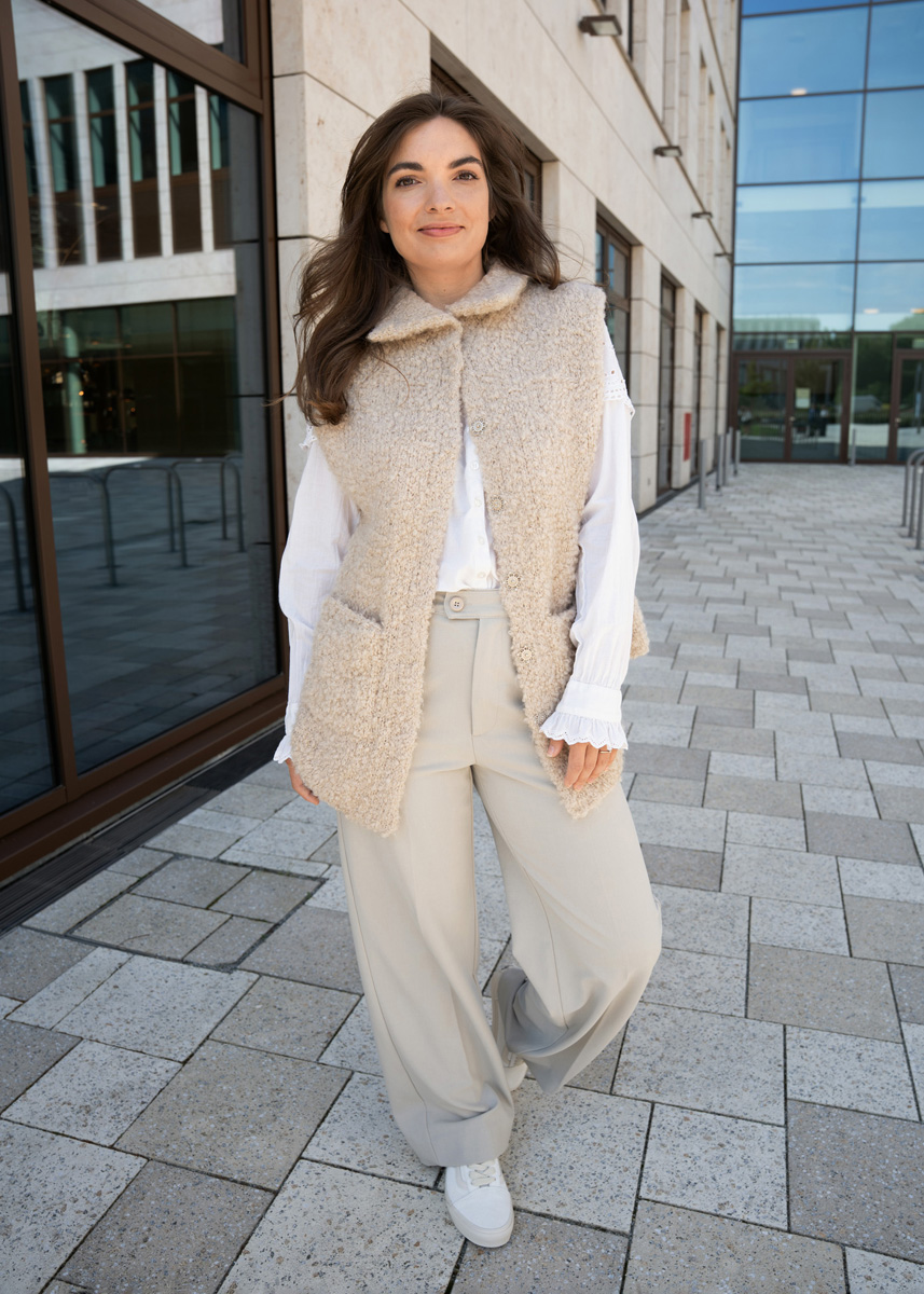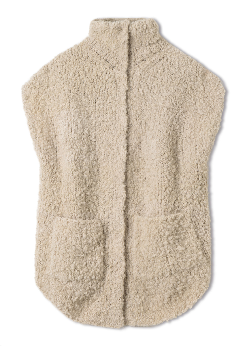 Die Arcticteddyvest ist eine oversized getragene, vom klassischen Hemd inspirierte Weste. Sie wird nahtlos von oben nach unten in glatt rechts gearbeitet und gewinnt durch das verwendete Bouclé-Garn ihre weiche, voluminöse Struktur. Ein eleganter Hemdkragen, eine schmale Knopfleiste mit unsichtbaren Druckknöpfen sowie aufgesetzte Taschen verleihen ihr eine klare, moderne Linie – ideal über Blusen oder Hemden und warm genug für die kommende Herbstsaison.