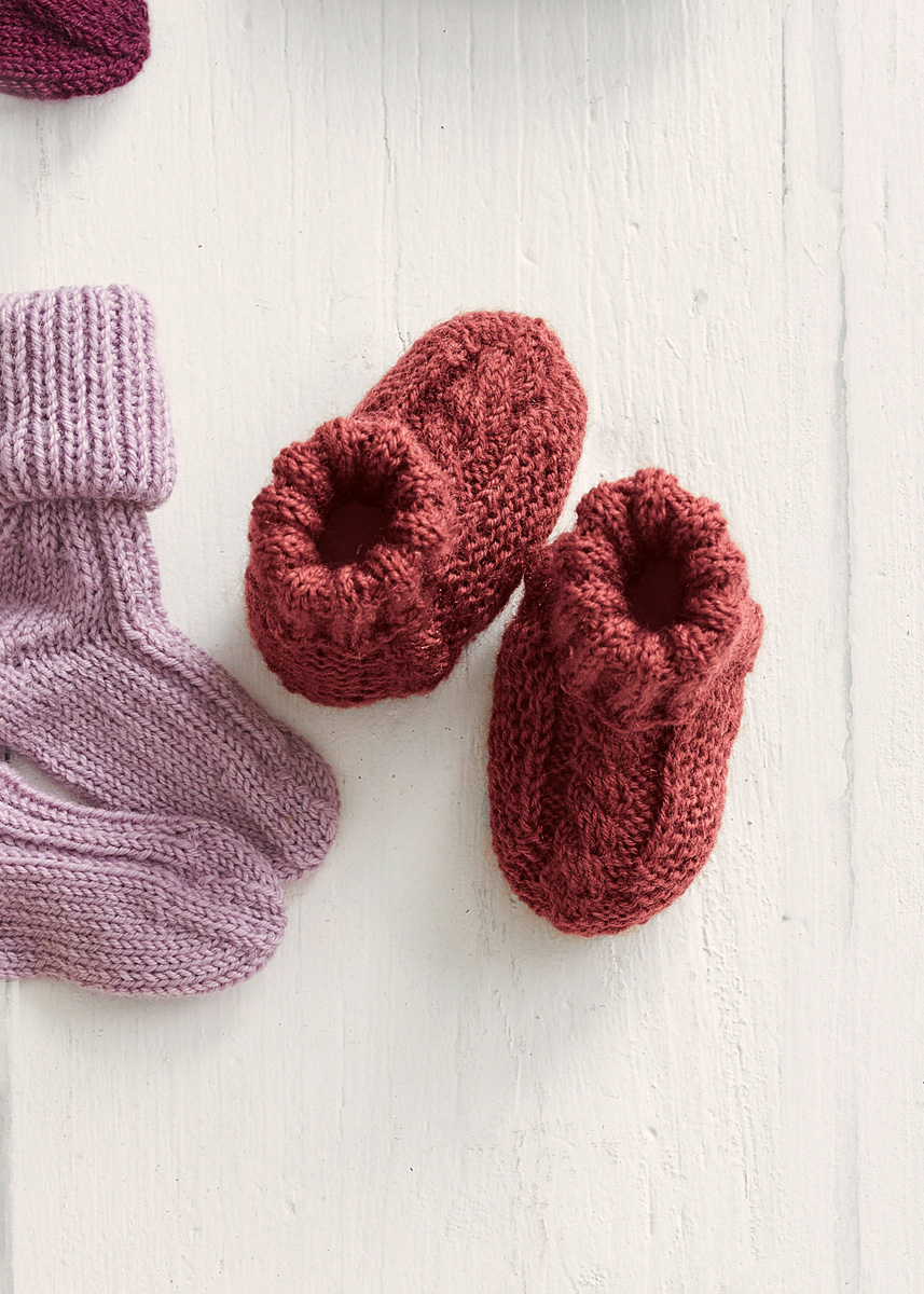 Lana Grossa „Meilenweit 50g“ (80% Schurwolle, 20% Polyamid, Lauflänge 210 m/50 g): 50 g Indischrot (Fb 1419); Nadelspiel Nr. 2,5, 1 Hilfs- oder Zopfnadel und 2 Maschenmarkierer