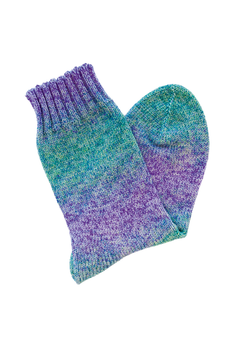 Lana Grossa „Meilenweit 100g Merino Extrafine Shades“ (75 % Schurwolle (Merino extrafine), 25 % Polyamid, Lauflänge = 420 m / 100 g): 100 g Türkis-/Petrol-/Gelbgrün/Blasslila/Violett (Fb 7230); Nadelspiel Nr. 2,5.