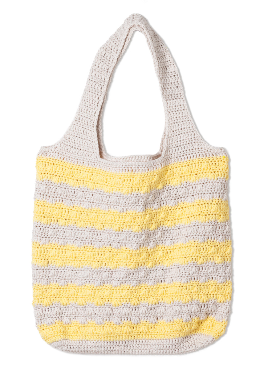 Lana Grossa-Qualität „Cotonella” (100 % (Pima) Baumwolle, LL = ca. 140 m/50 g): je ca. 150 g Pastellbeige (Fb. 202) und Gelb (Fb. 205); 1 Wollhäkelnadel Nr. 4.