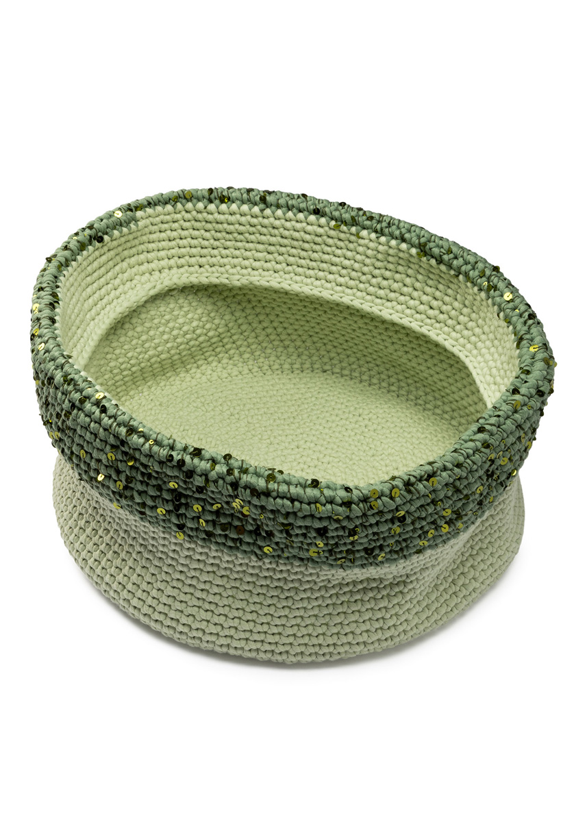 Lana Grossa-Qualität „The Tube” (60% Baumwolle, 40 % Nylon, LL = ca. 114 m/200 g): ca. 600 g Weißgrün (Fb. 31) und ca. 200 g Resedagrün (Fb. 11) und Lana Grossa- Qualität „Cosmo” (100 % Baumwolle (plus Pailletten), LL = ca. 260 m/100 g): ca. 100 g Dunkeloliv (Fb. 22); 1 Wollhäkelnadel Nr. 7.