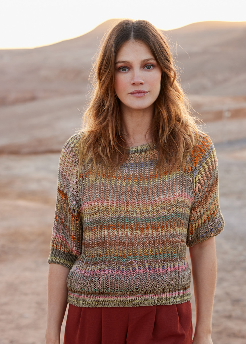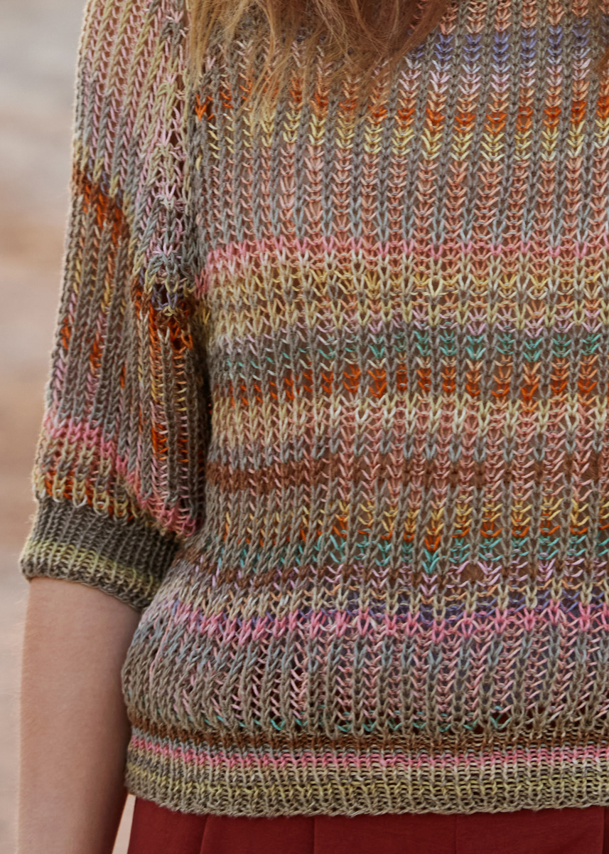 Lana Grossa-Qualität „Gomitolo Lino“ (60 % Baumwolle, 28 % Viskose, 12 % Leinen, LL = ca 290 m/100 g): 2 (2 - 2 - 2) Knäuel = ca 200 (200 - 200 - 200) g Pfirsich/ Vanille/Rosa/Orange/Graulila/Mint (Fb 2013) und 2 (2 - 2 - 2) Knäuel = ca 200 (200 - 200 - 200) g Beige/Graubraun/Grau/ Rosa/Natur/Taupe (Fb 2018); lange und kurze Rundstricknadel Nr 3,5 und 4.