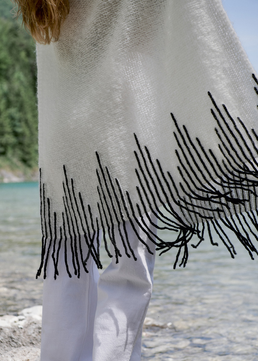 Das rohweiße Set wird glatt links gestrickt. Für Folklore-Appeal sorgen schwarze, aufgehäkelte Streifen, die bei der Stola in Fransen münden.