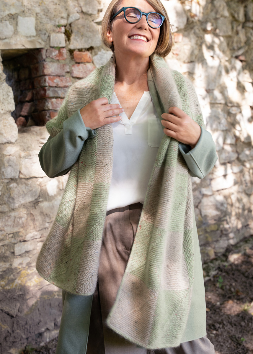 Für die Cara-Stola werden insgesamt 33 Patches abwechselnd in der Farbkombination Perlbeige mit Natur und Pastellgrün mit Graugrün gearbeitet. Dabei werden die Patches gleich so aneinander gestrickt, dass sich 3 Reihen aus jeweils 11 Patches im Schachbrettmuster übereinander reihen. Anschließend wird die Stola rundherum mit einem Kordelrand eingefasst.