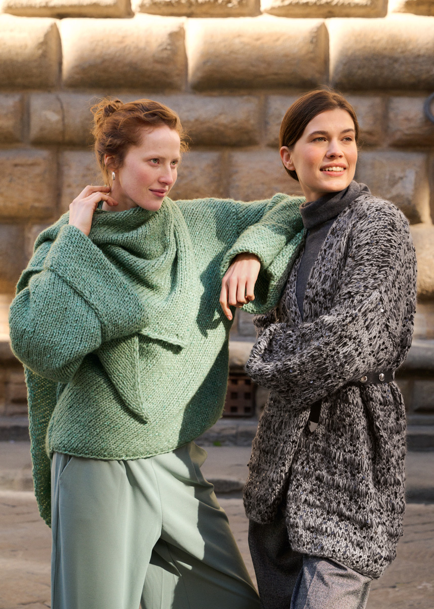 Che bello: der glatt rechts gestrickte Mouline-Cardigan mit Pailletten, Fallmaschen und weiten Ärmeln. Damit es gut sitzt, wird die Schulter leicht abgeschrägt. Der Cardigan wird stets mit 3fachem Faden gestrickt - je Qualität 1 Faden.