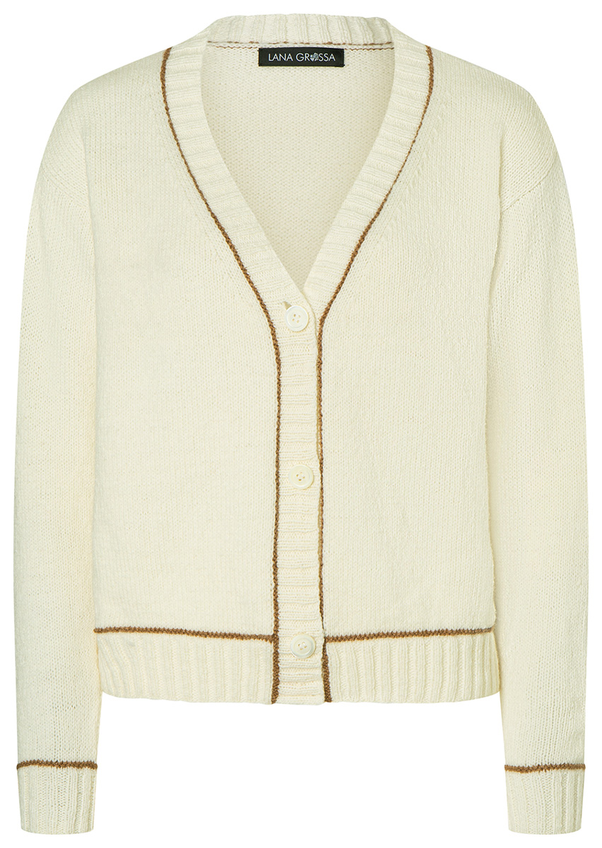 Lana Grossa Cashmere 16 Fine (80% Schurwolle (Merino), 10% Kaschmir, 10% Polyamid, Lauflänge 320 m/50 g), 300 (350 – 400) g Rohweiß (Fb 9) und 50 g Camel (Fb 45); Stricknadeln Nr. 3 und 4, 1 Rundstricknadel Nr. 3, 100 cm lang, 3 Knöpfe von UNION KNOPF, Art. 18001, Fb 99, Ø 20 mm.