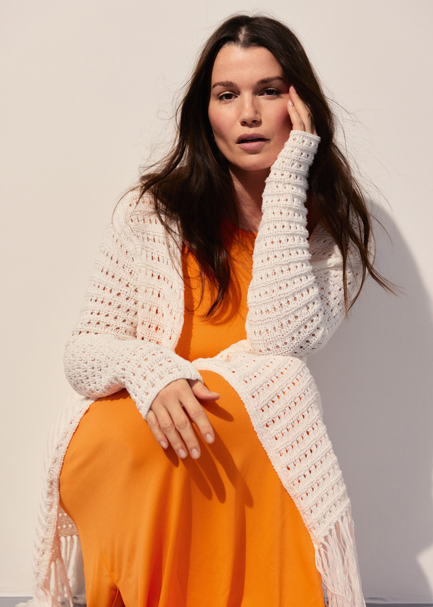 Fransen sorgen für Schwung, Allure und Hippie- Appeal. Hier schmücken sie einen weißen Baumwoll- Leinen-Cardigan aus Lochmuster und glatt rechts gestrickten Reihen. (Anleitung bis Größe 48/50). Das dazu passende Top finden Sie bei Modell 12.