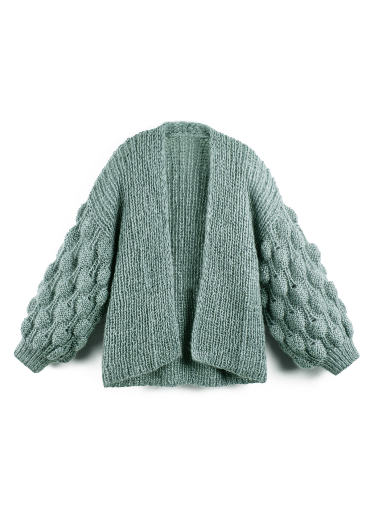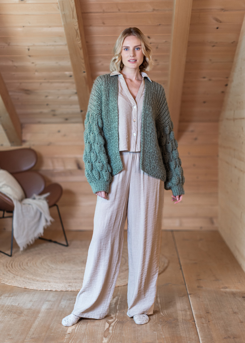 Der Cardigan wird durchgehend mit doppeltem Faden gestrickt. Rücken- und Vorderteile werden bis zu den Armausschnitten in einem Stück gestrickt. Die Maschen für die Ärmel werden anschließend aus dem Armausschnitt aufgefasst. Das Modell hat eine Gesamtlänge von 60 (62 - 64 - 66 - 68 - 70) cm und eine Brustmehrweite von 4 cm bei 80 cm Brustumfang (3 cm bei 88 cm Brustumfang - 4 cm bei 96 cm Brustumfang - 3 cm bei 104 cm Brustumfang - 4 cm bei 116 cm Brustumfang - 3 cm bei 128 cm Brustumfang).