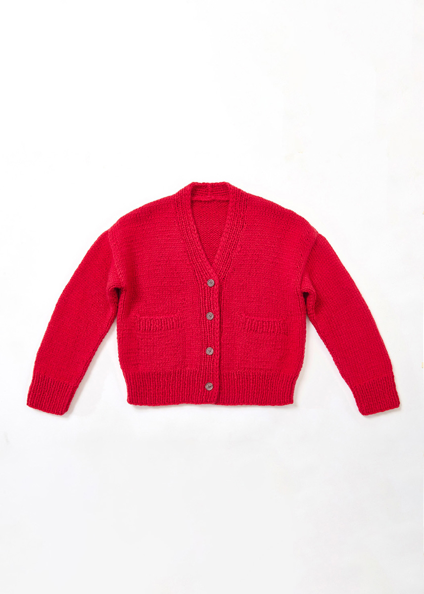 Garn von Lana Grossa, Qualität „Winter Softness“ (62 % Schurwolle (Merino Extrafine), 38 % Baumwolle (Bio), LL = ca. 70 m/50 g): 650 (700/750/800) g in Rot Nr. 12. Stricknadeln 6 und 7 (wenn Sie locker stricken) oder 7 und 8 (wenn Sie fest stricken) – wichtig ist, dass Sie auf die Angaben in der Maschenprobe kommen. 4 Knöpfe in Dunkelrot Farb-Nr. 54, 23 mm Durchmesser, Artikel-Nr. 453066 von Union Knopf.