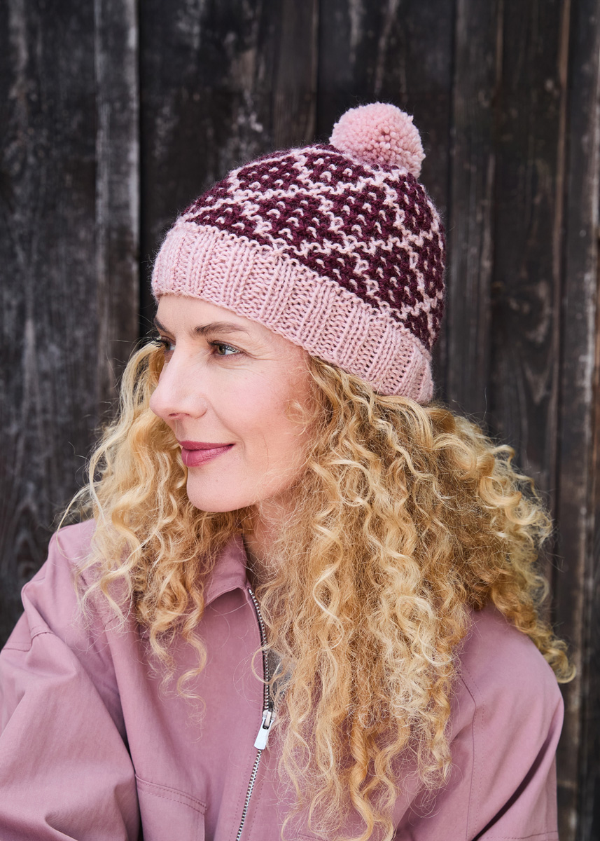 Lana Grossa-Qualität „Landlust-Naturwolle“ (100 % norwegische Schurwolle, LL ca. 85 m/50 g), je 50 g in Graurosa (Fb 19) und in Burgund (Fb 20); 1 Rundstricknadel Nr. 5, 40 cm lang, 1 Nadelspiel Nr. 5, 1 Pompon-Maker für Pompons mit 6 cm ø.