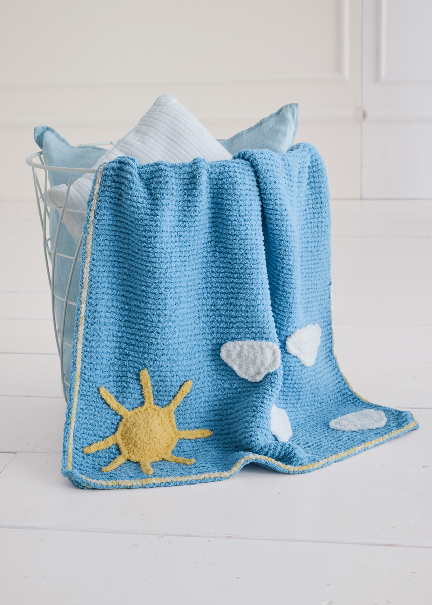 Lana Grossa Leggerissimo (100% Polyamid (rec.); LL = 150 m/50 g): 300 g Hellblau (Fb. 13) und je 50 g Gelb (Fb. 1) und Weiß (Fb. 17); eine Rundstricknadel 5 mm; je eine Häkelnadel 3 mm und 5 mm; Füllwatte.