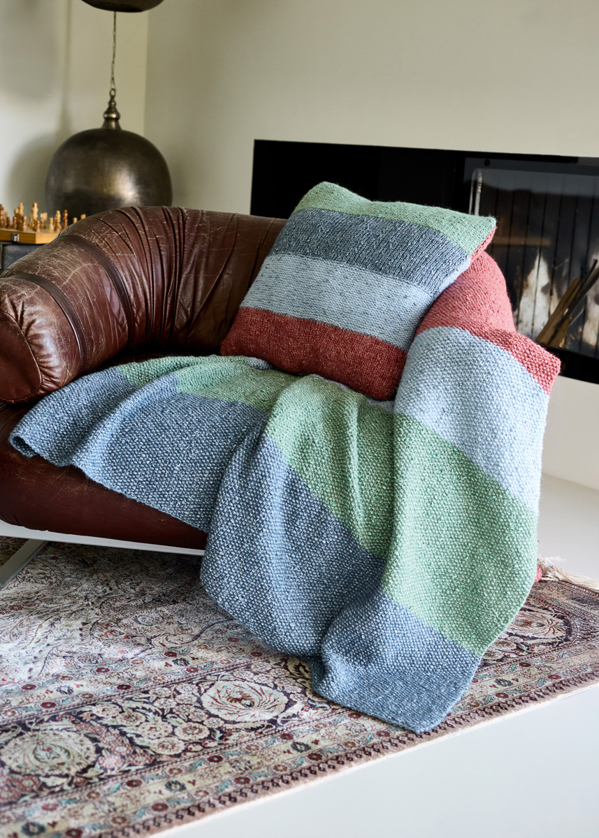 Lana Grossa-Qualität „Lucciola” (29 % Polyamid, 24 % Schurwolle (Merino Fine), 22 % Viskose, 20 % (Baby) Alpaka, 5 % metallische Faser, LL = ca. 130 m/50 g): ca. 500 g Terrakotta (Fb. 9), je ca. 150 g Grün (Fb. 3) und Hellblau (Fb. 5) und ca. 100 g Graublau (Fb. 4); 1 Rundstricknadel Nr. 5, 120 cm lang.