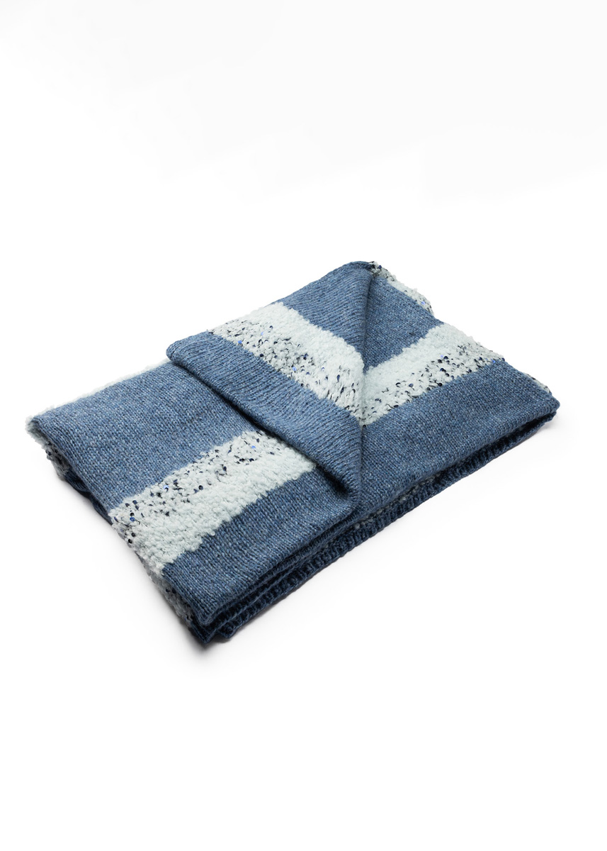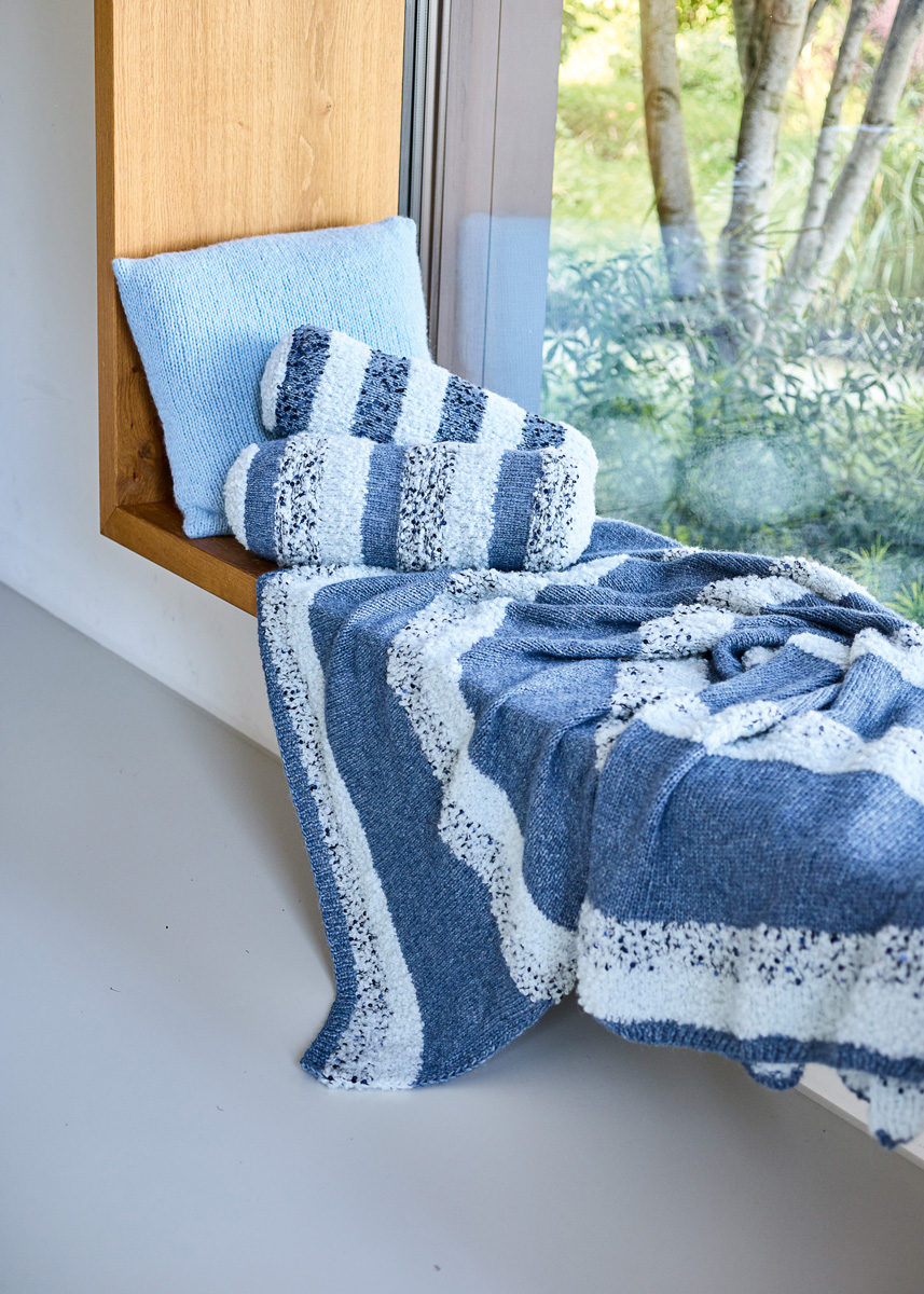 Lana Grossa-Qualität „Orsetto” (60 % Schurwolle (Merino), 40 % Alpaka (superfine), LL = ca. 75 m/50 g): ca. 400 g Weißblau (Fb. 1), Lana Grossa-Qualität „Brigitte No. 2” (47 % (Baby) Alpaka, 45 % Baumwolle, 8 % Schurwolle (Merino), LL = ca. 140 m/50 g): ca. 450 g Jeans (Fb. 6) und Lana Grossa-Qualität „Cosmo” (100 % Baumwolle (plus Pailletten), LL = ca. 260 m/100 g): ca. 100 g Nachtblau (Fb. 19); 1 Rundstricknadel Nr. 6, 120 cm lang.