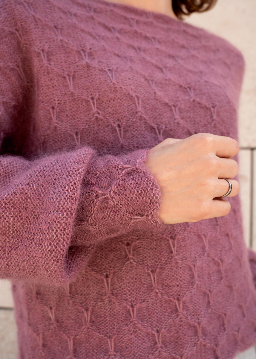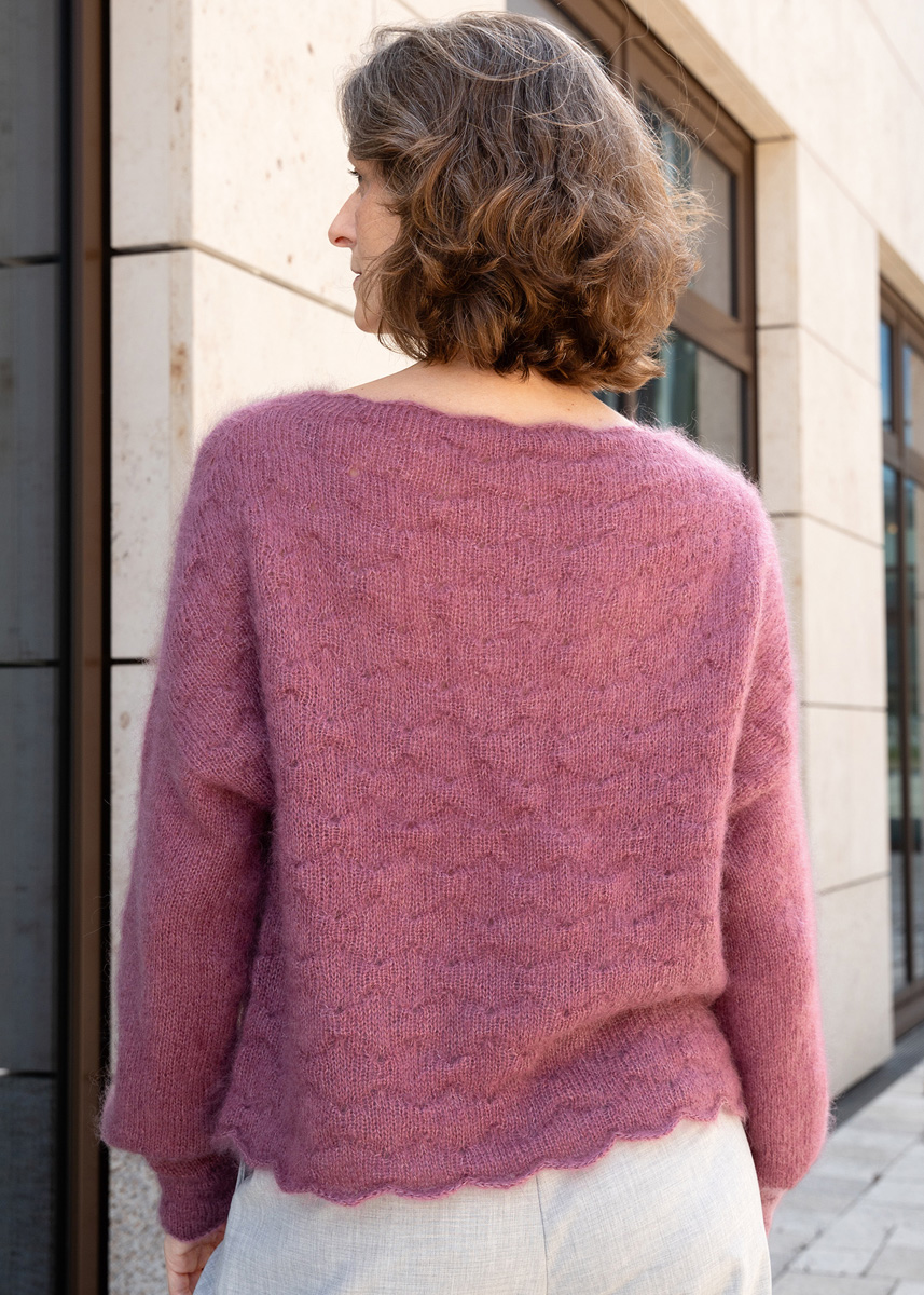 Der Sweater wird nahtlos top-down von oben nach unten gestrickt. Zunächst entsteht der Kragen im Strukturmuster. Verkürzte Reihen formen anschließend den vorderen Halsausschnitt, während seitliche Zunahmen die Schultern aufbauen. Nach Erreichen der gewünschten Schulterbreite werden Vorder- und Rückenteil getrennt in Reihen gearbeitet, bis die Passenhöhe abgeschlossen ist. Danach werden beide Teile verbunden und der Rumpf in Runden fertiggestellt. Die Ärmel werden direkt angestrickt und glatt rechts in Runden gearbeitet. Im unteren Bereich sorgen Abnahmen für die Formgebung, zusätzliche 5 cm Mehrlänge erzeugen den charakteristischen Ballon-Effekt. Bündchen und Saum gehen zum Abschluss wieder ins Strukturmuster über.