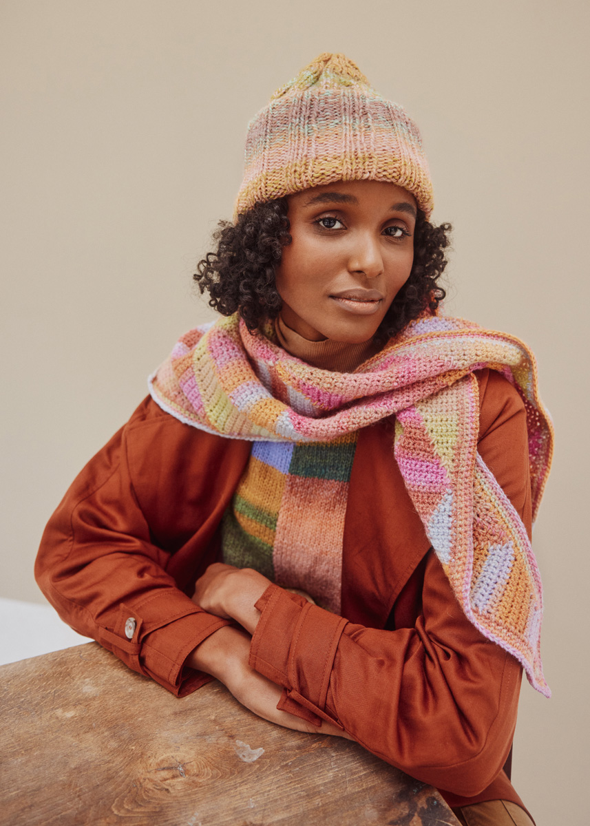 Lana Grossa-Qualität „Gomitolo Pablo“ (60 % Schurwolle, 40 % Polyacryl, LL = ca 700 m/200 g): 1 Knäuel = ca 200 g Pastellgrün/Grüngelb/Pfirsich/Orange/Pink/Rosa/ Lila (Fb 3011); Häkelnadel Nr 4.