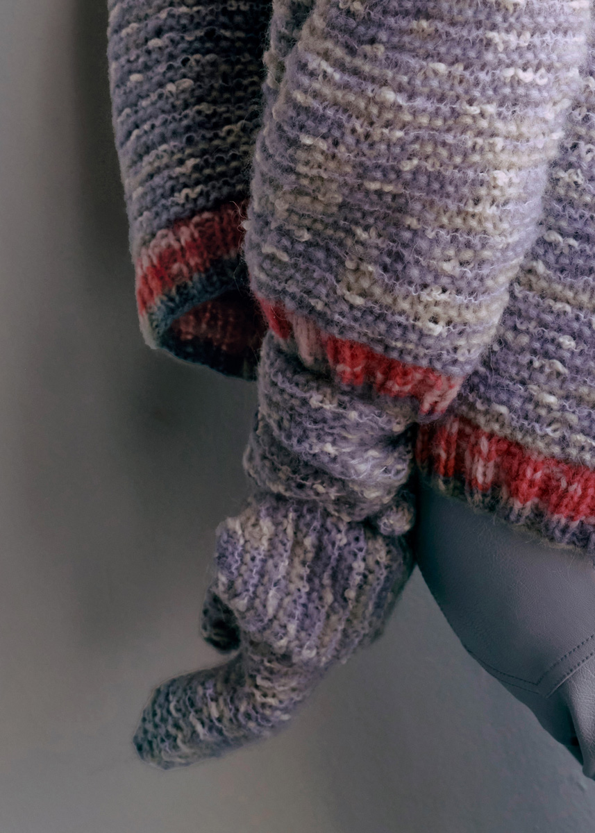 Lana Grossa-Qualität „Lala Berlin Smoothy“ (62 % Alpaka (Baby), 27 % Polyamid, 11 % Schurwolle (Merino Fine), LL = ca 135 m/50 g): ca 50 g Flieder/ Hellbeige (Fb 2); Lana Grossa-Qualität „Lala Berlin Buffy“ (47 % Alpaka (Baby), 30 % Baumwolle, 23 % Polyamid, LL = ca 225 m/50 g): ca 50 g Lila/Rohweiß (Fb 3); 1 Nadelspiel Nr 5; 1 Sicherheitsnadel; Maschenmarkierer.