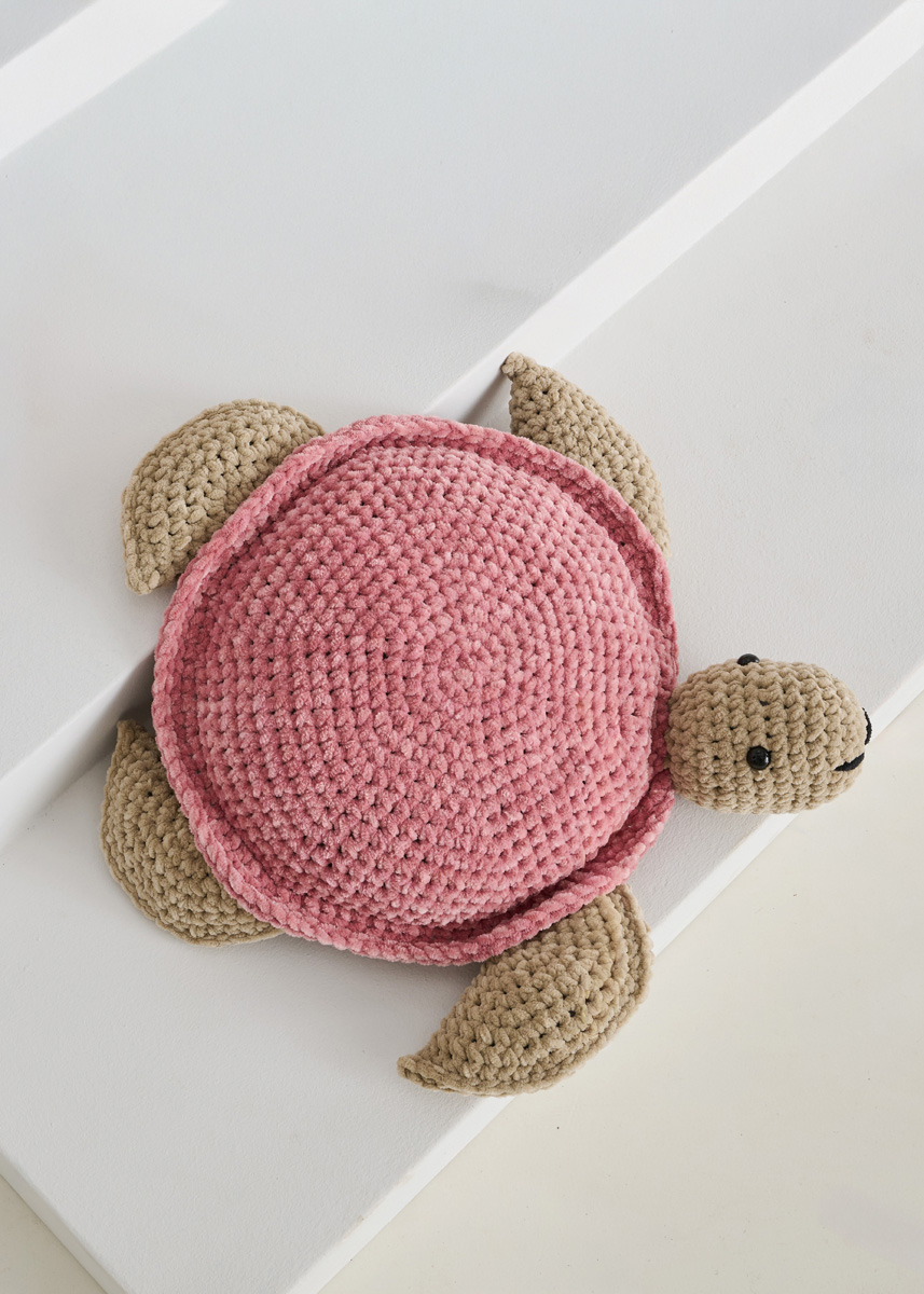 Lana Grossa The Look (100% Polyester; LL = 120 m/100 g): je 100 g Altrosa (Fb. 4), Beige (Fb. 23), Nougat (Fb. 12) und Schwarz (Fb. 13); eine Häkelnadel 7 mm; Sicherheitsaugen mit 15 mm Ø; ein rundes Kisseninlett mit 30 cm Ø; Füllwatte.