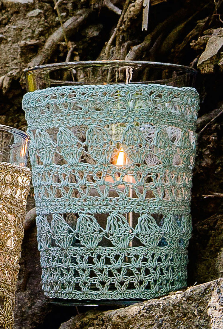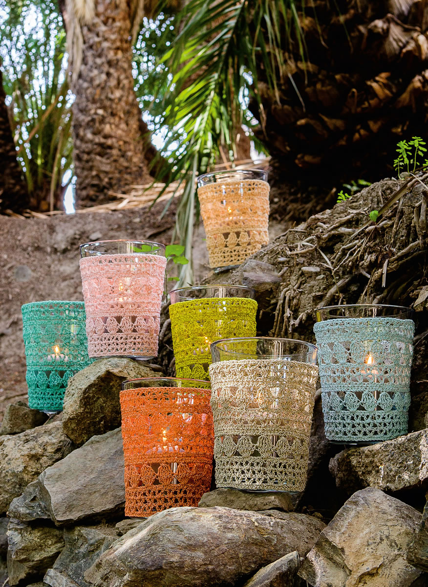 Perfekt für Ihre Garten-Party: Häkel-Manschetten in Softeisfarben, die aus Windlichtern wahre Blickfänger machen.