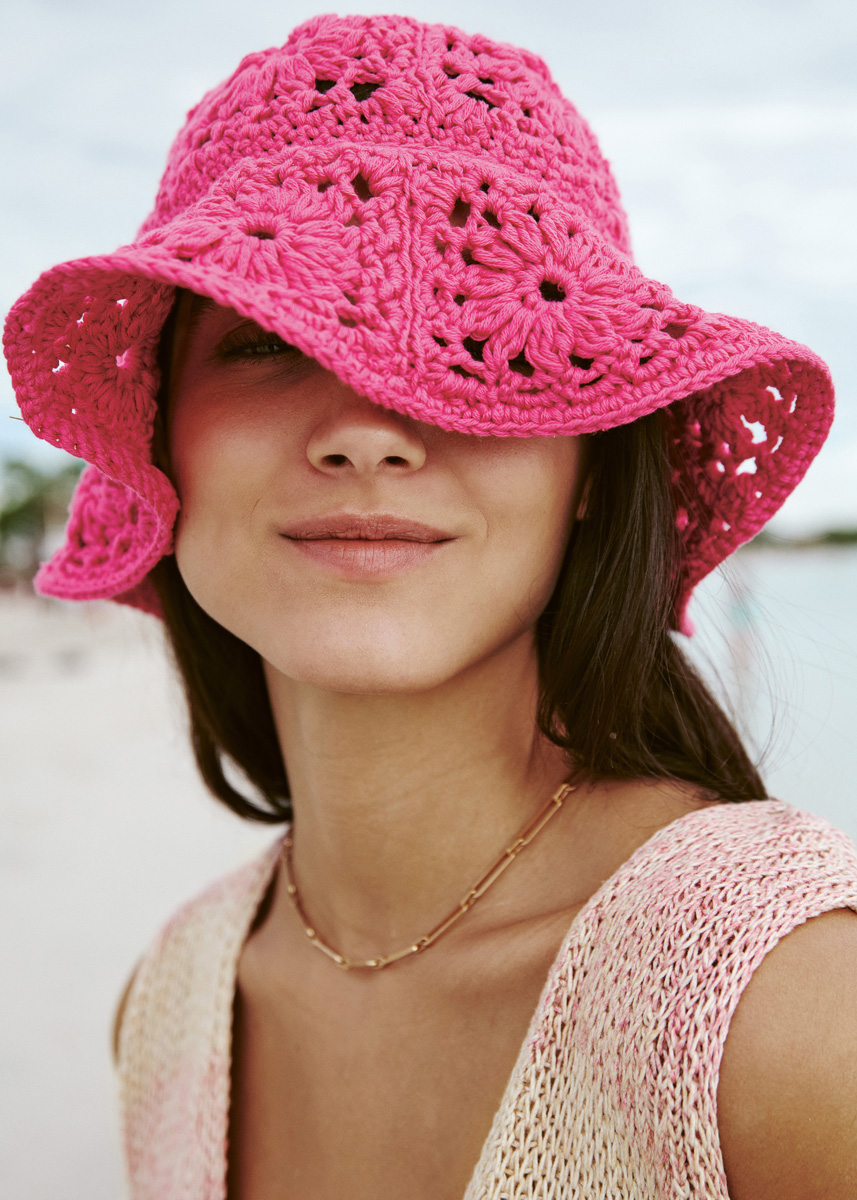 Ein cooler Seventies-Hut aus Granny- Squares mit rundgehäkeltem „Dach“. Der Clou: Seine Krempe ist mit Draht verstärkt und erlaubt so ein individuelles Styling.