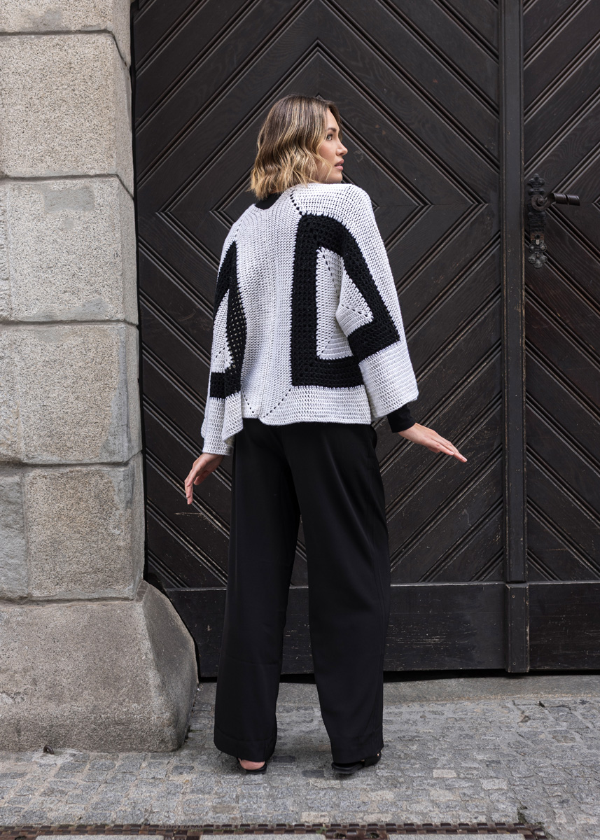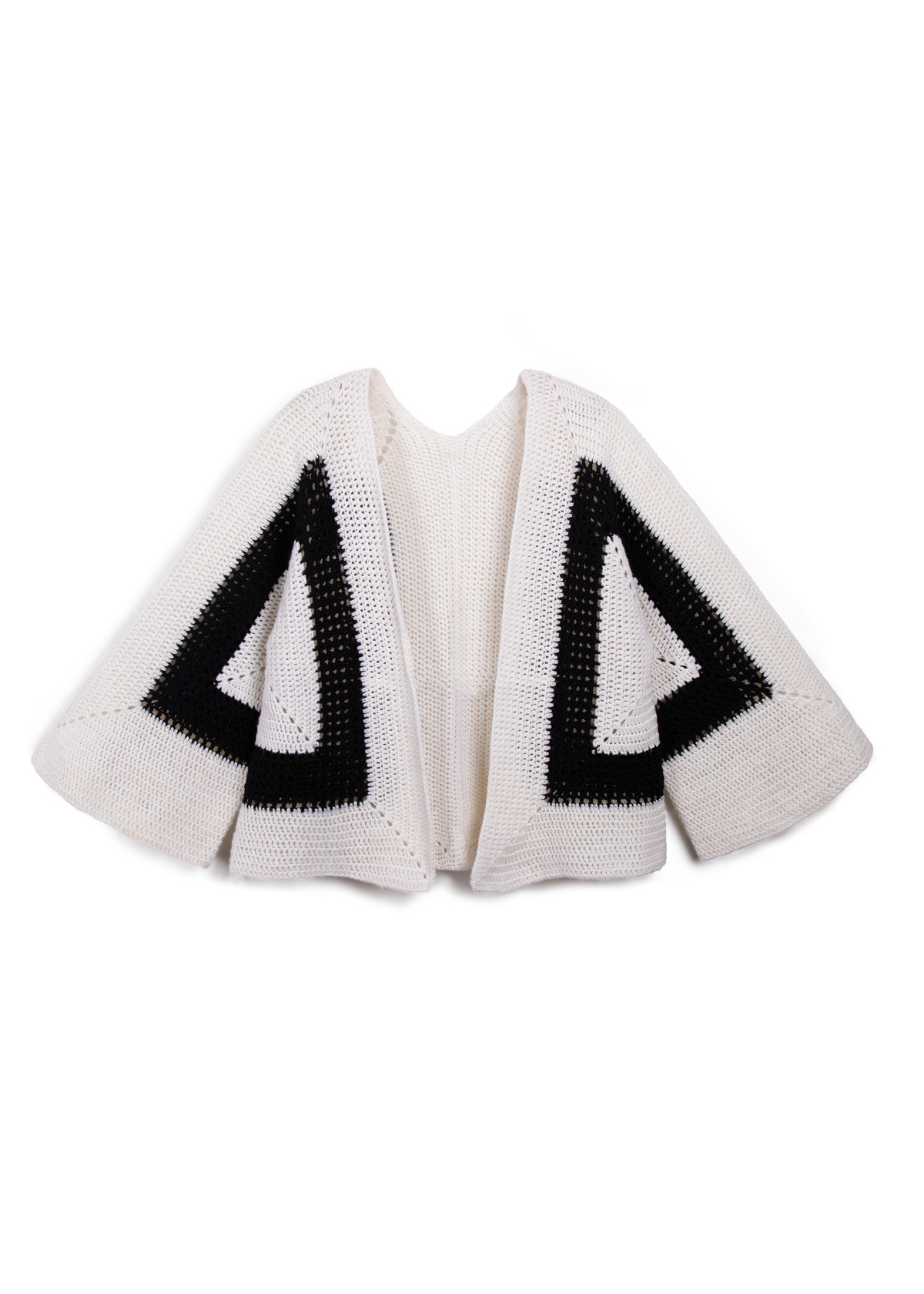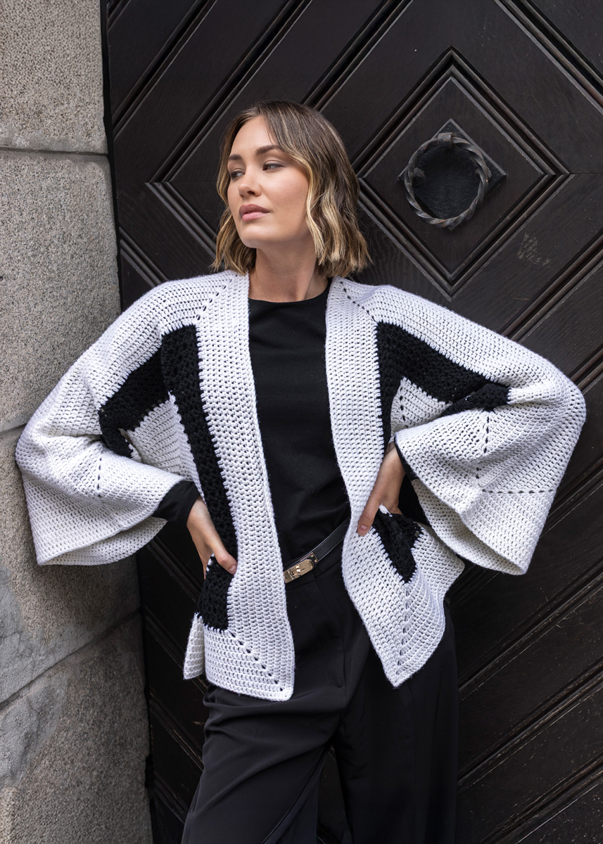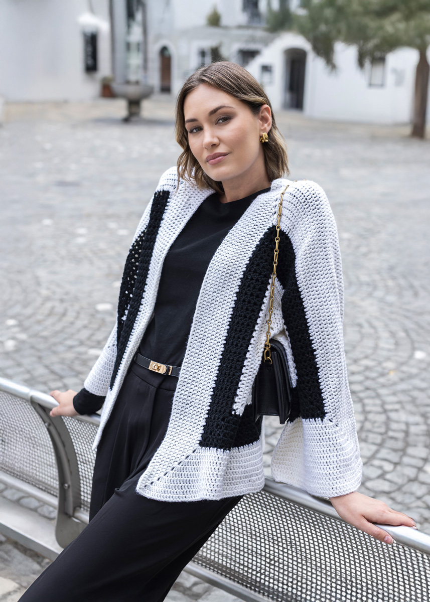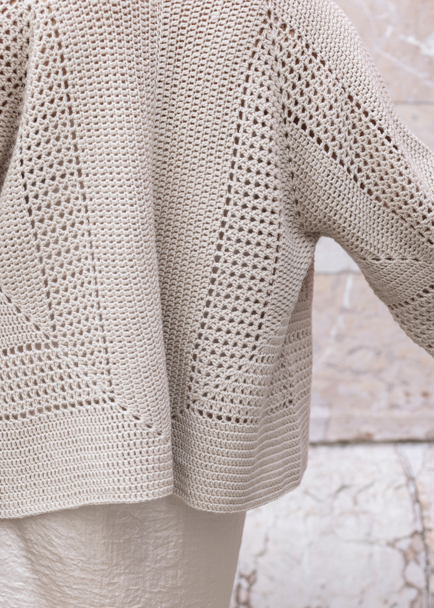 Die Jacke besteht aus zwei Sechsecken, die jeweils ausgehend vom Unterarm in Runden gehäkelt werden. Das Modell hat eine Länge von 58 (62 - 67) cm und eine Brustmehrweite von 36-28 cm bei 80-88 cm Brustumfang (36-28 cm bei 96- 104 cm Brustumfang - 36-24 cm bei 116-128 cm Brustumfang).