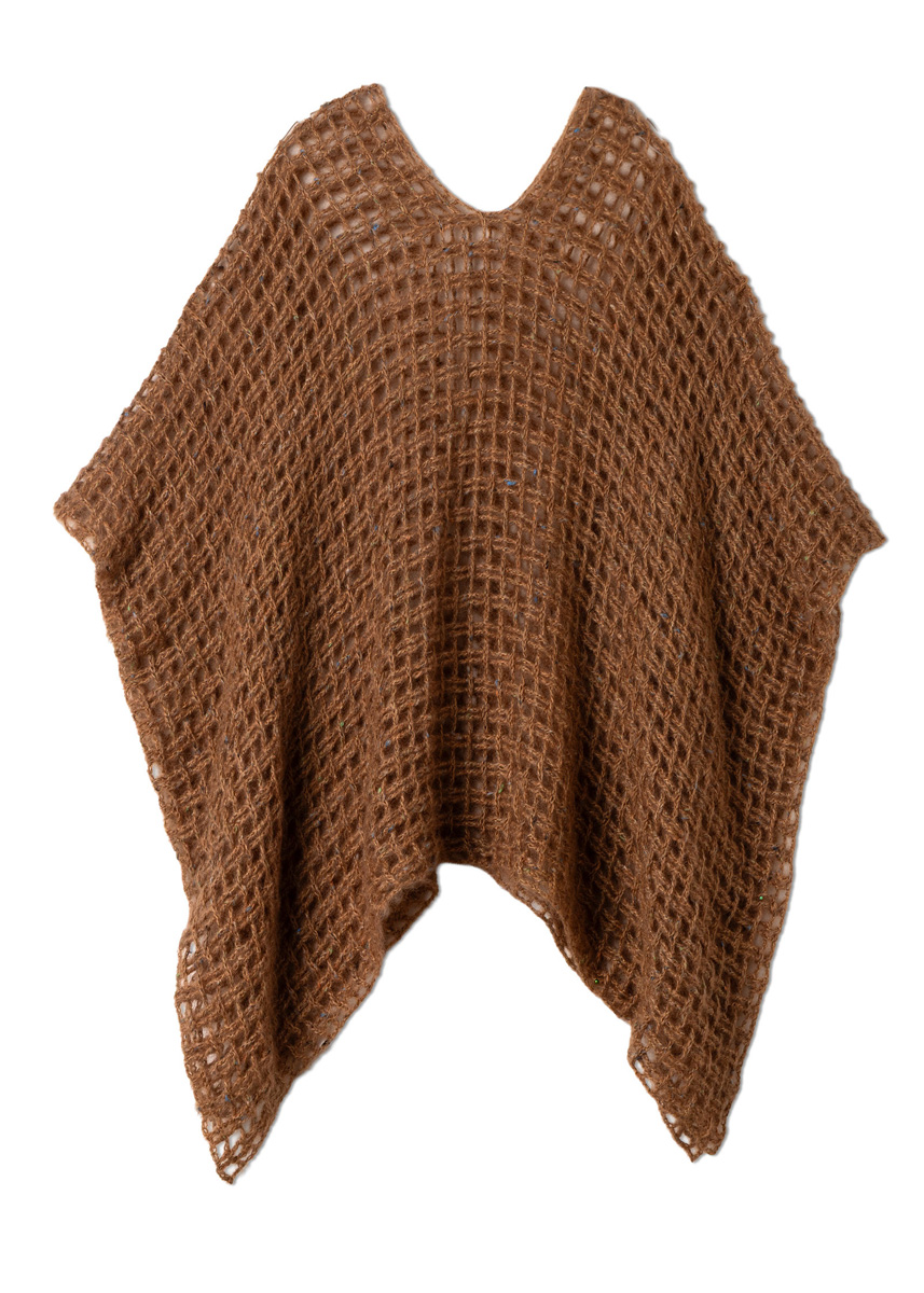 Lana Grossa Natural Superkid Tweed (60% Mohair, (Superkid), 30% Seide, 7% Baumwolle, 3% Polyester, LL = ca. 200 m/25 g), 275 (350) g in Camel (Fb 620). 1 Häkelnd Nr. 4,5.