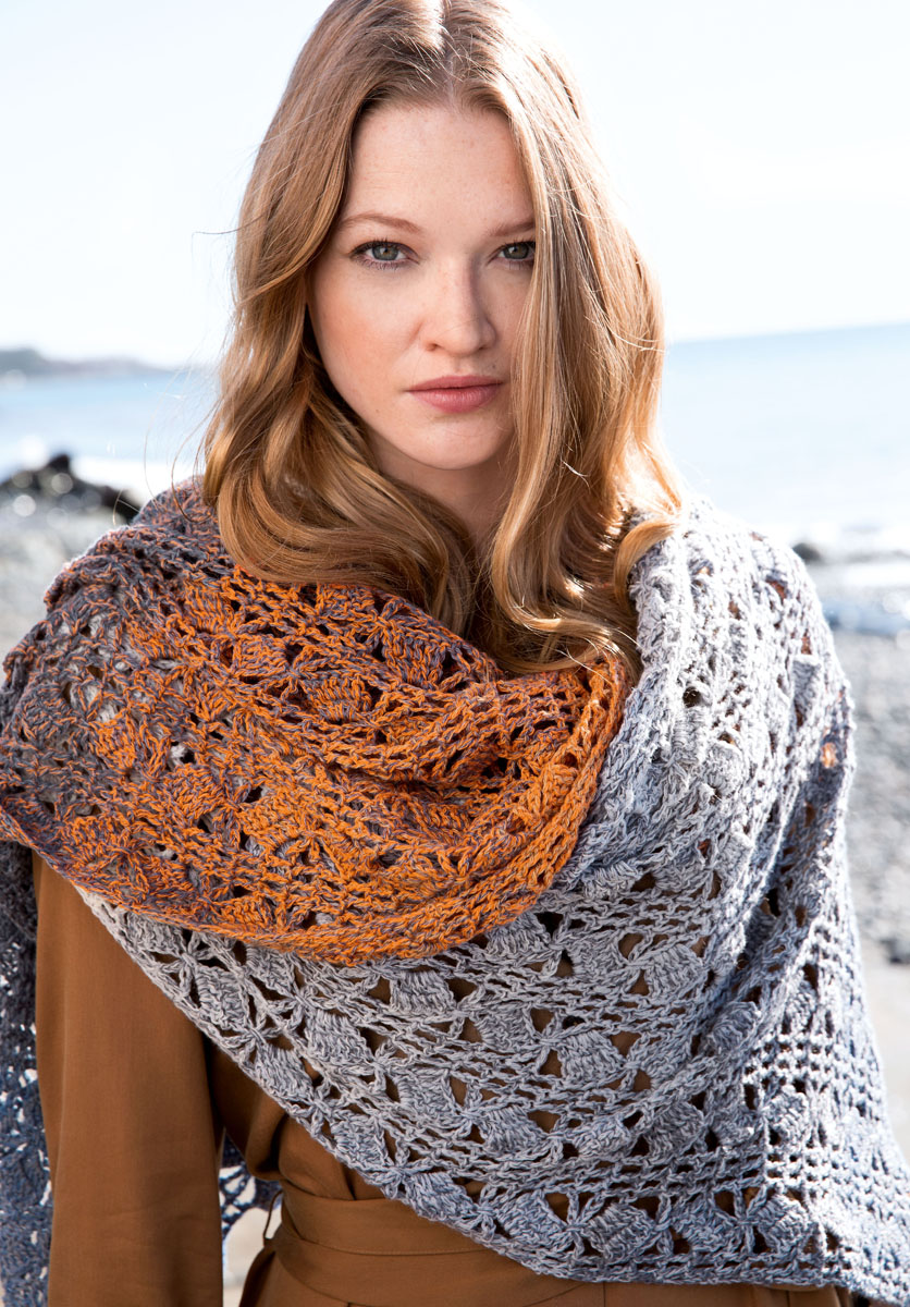 Lana Grossa-Qualität „Shades of Merino Cotton“ [50 % Schurwolle (Merino extrafine), 50 % Baumwolle, LL = ca. 760 m/200 g]; je 200 g Weiß/Silbergrau/Grau/Dunkelgrau/Anthrazit (Fb 408) und Sand/Orange/Khaki/Dunkelgrau (Fb 609); eine Häkelnadel Nr. 4,5