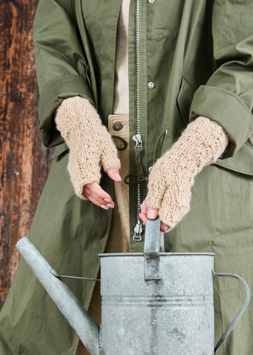 Lana Grossa-Qualität „Landlust- Naturwolle“ (100% norwegische Schurwolle, LL ca. 85 m/50 g), 100 g in Beige (Fb 17); 1 Nadelspiel Nr. 5, 1 Hilfs- oder Zopfnadel.