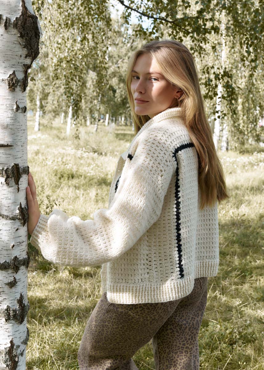 Mit großem Kragen und markanten Farbakzenten erinnert diese Jacke an die Blousons der 1960er. Das Modell besteht aus luxuriösen Kaschmir- Baumwoll-Garnen. Für ein interessantes Maschenbild wird doppelfädig, mal quer und mal längs gehäkelt.