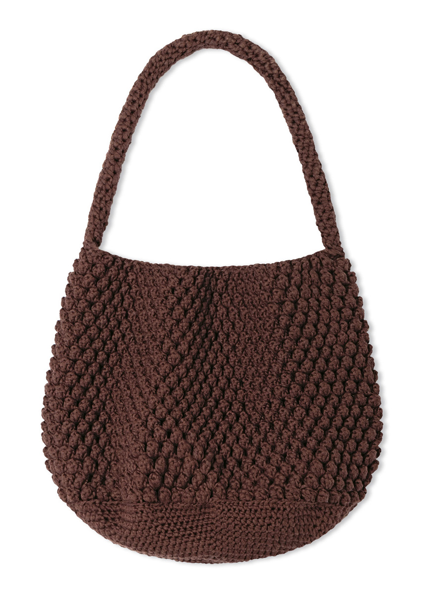Dunkelbraunes Kreppgarn betont den luxuriösen Look dieser Filetmuster-Kombi. Stimmiges Finish: die passende Tasche mit Noppenstruktur.