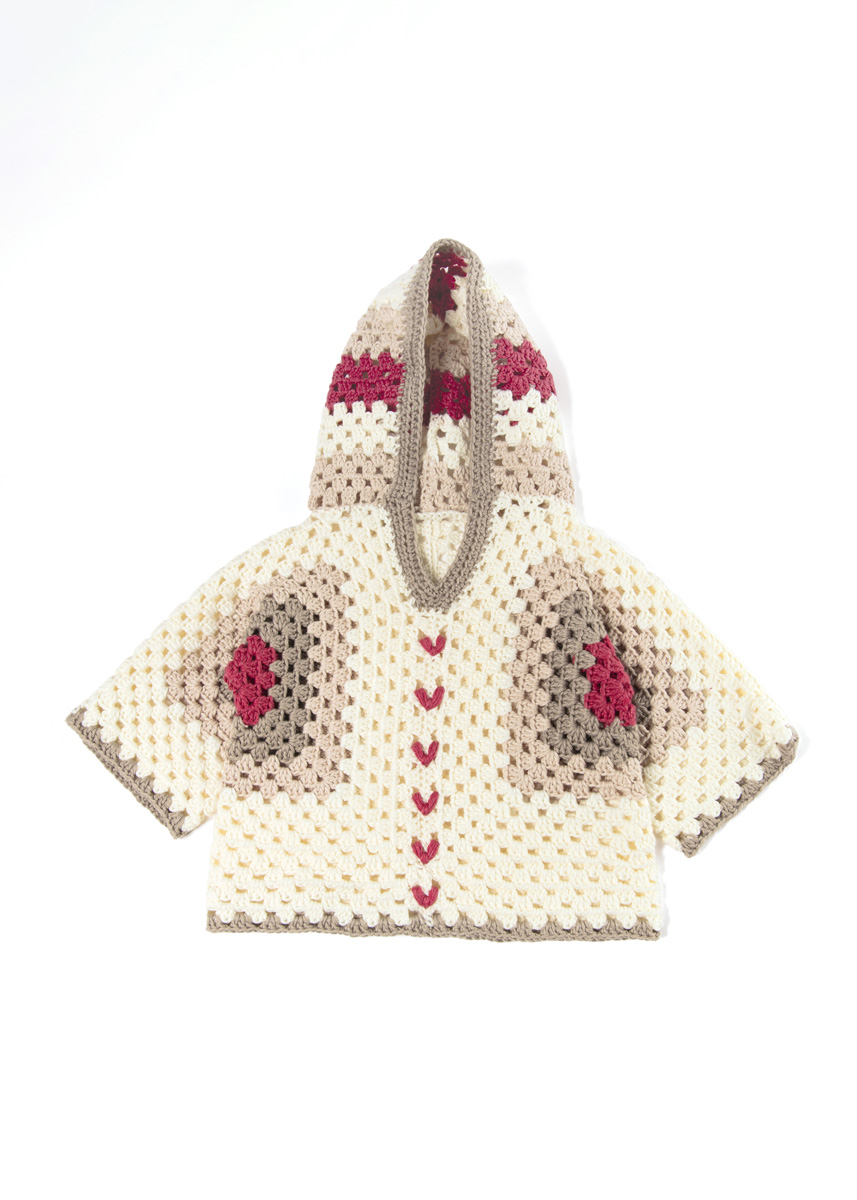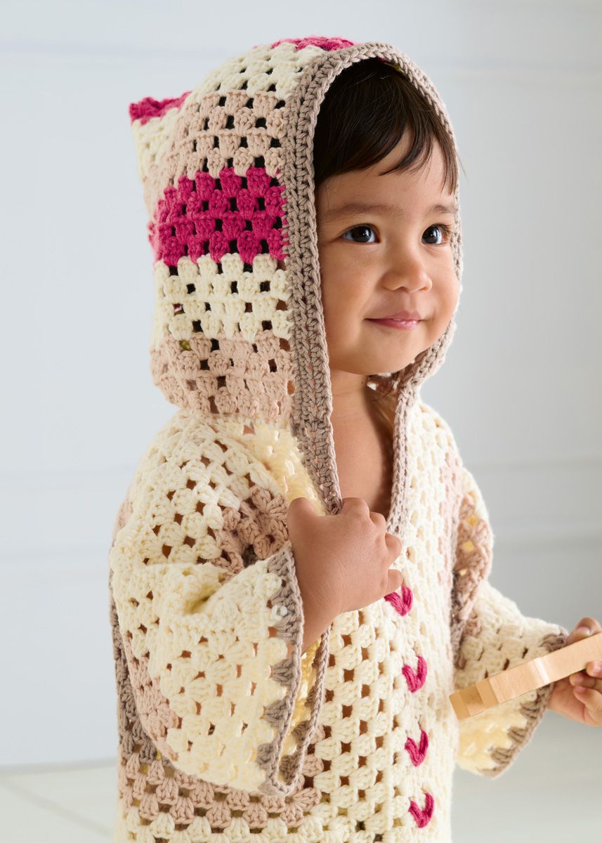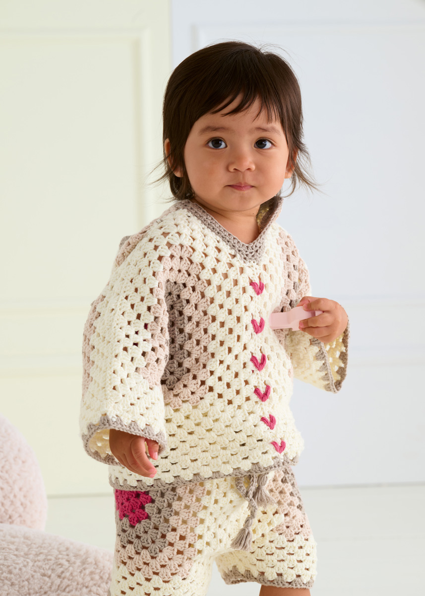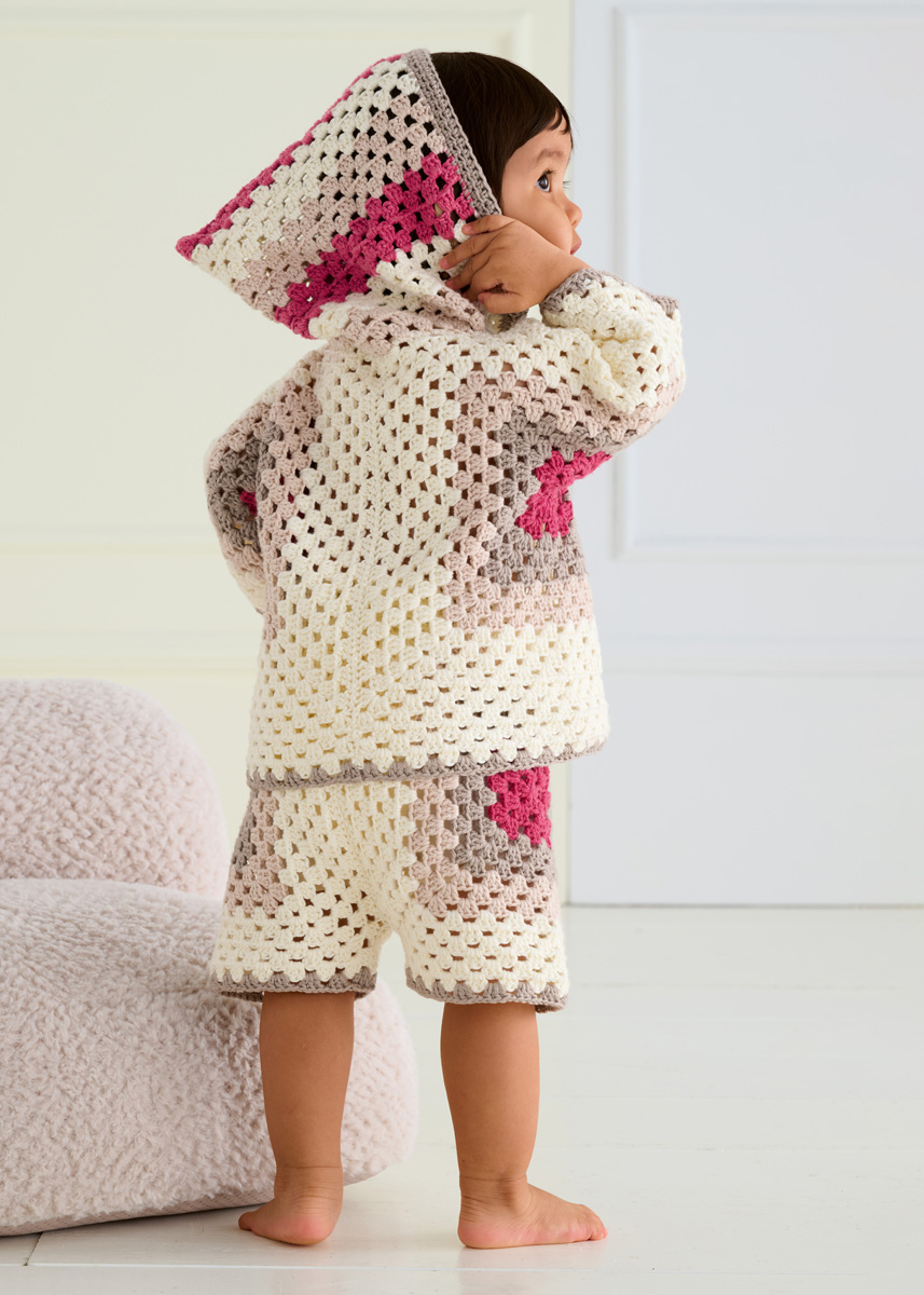 Lana Grossa Soft Cotton (70% Baumwolle, 30% Polyacryl; LL = 140 m/50 g): 100 (150/150/200) g Ecru (Fb. 2), 50 (50/100/100) g Beige (Fb. 3) und je 50 g Pink (Fb. 63) und Graubeige (Fb. 4); eine Häkelnadel 4 mm; entfernbare Maschenmarkierer (alternativ Sicherheitsnadeln).