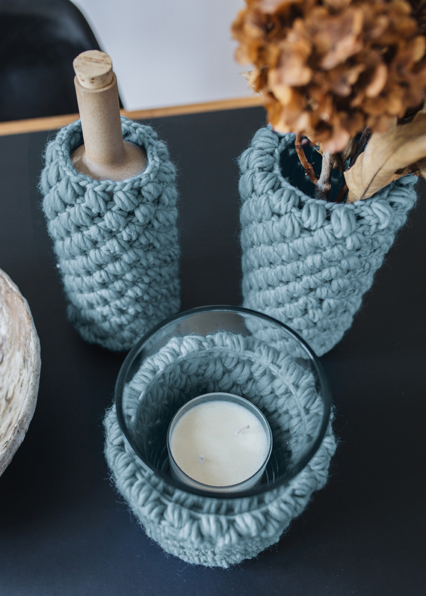 Upcycling ist eine gute Sache. Hier bekommen ausgediente Vasen und Gläser neuen Schwung – mit ausdrucksvoll genoppten Hussen aus hellblauer, GOTS-zertifizierter Wolle.