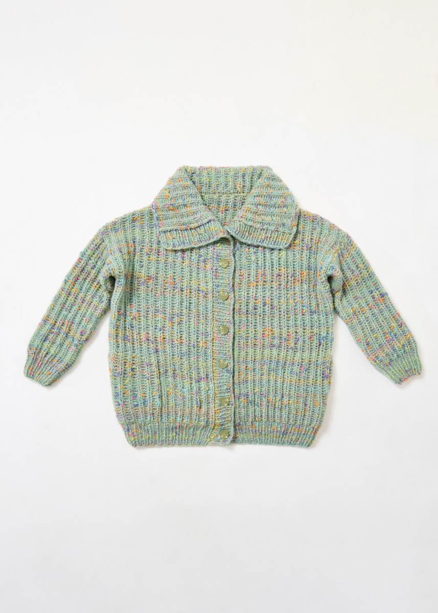 Garn von Lana Grossa, Qualität „Cassata“ (54 % Schurwolle (Merino extrafine), 30 % Polyamid, 16 % Baumwolle, LL = ca. 175 m/50 g): 500 (550/600/650) g in Zartgrün/Hellorange/Rosa/ Hellgrau/Lila Nr. 11. Stricknadeln 7 und 8 (wenn Sie locker stricken) oder 8 und 9 (wenn Sie fest stricken) – wichtig ist, dass Sie auf die Angaben in der Maschenprobe kommen. 9 Knöpfe in Grün Farbnummer 34, 25 mm Durchmesser, Artikel-Nr. 13003 von Union Knopf.