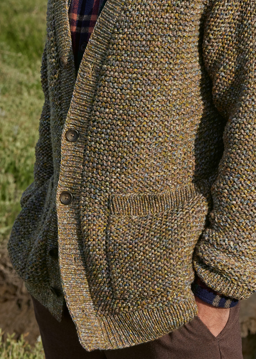 Lana Grossa Cool Merino Print (90% Schurwolle (Merino), 10% Polyamid, Lauflänge 150 m/50 g), 850 (900 – 950) g Senf/Grau/Beige/Oliv/Rosenholz (Fb 110); Stricknadeln Nr. 3,5 und 5,5, 1 Rundstricknadel Nr. 3, 80 cm lang und 5 Knöpfe von UNION KNOPF, Fb Braun, Ø 20 mm.