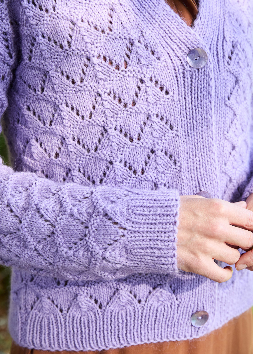 Lana Grossa-Qualität „Landlust- Alpaka-Merino 160“ (50 % Schurwolle (Merino), 50 % Alpaka (Baby), LL ca. 160 m/50 g), 350 g (400 g - 450 g) in Flieder (Fb 440) und „Landlust-Kidmohair“ (70 % Mohair Superkid, 30 % Baumwolle, LL ca. 225 m/25 g), 125 g (150 g - 175 g) in Graulila (Fb 13); Stricknadeln Nr. 4,5, 3 fliederfarbene Perlmuttknöpfe, ø 20 mm.