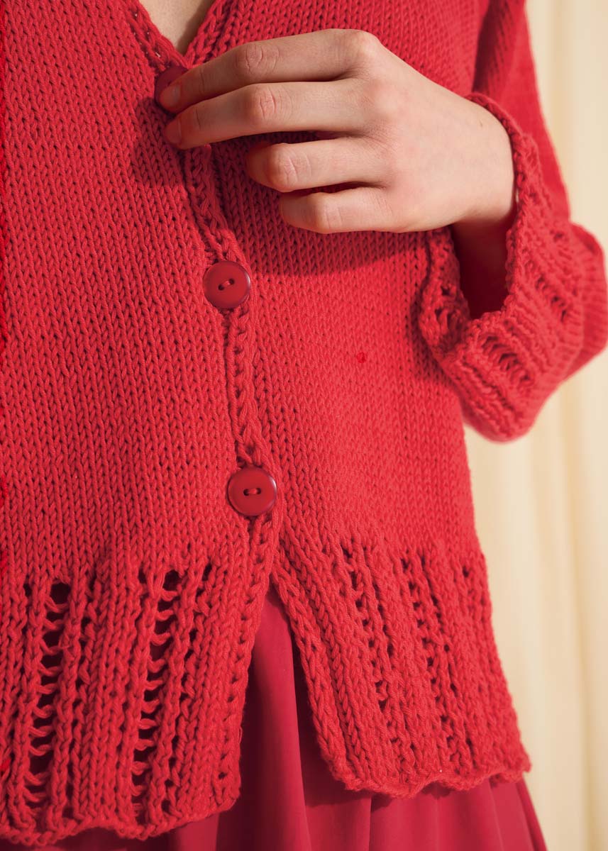 Lana Grossa Landlust Baumwolle (100% Baumwolle (Bio), Lauflänge 115 m/50 g), 450 (500 – 550) g Rot (Fb. 19); Stricknadeln Nr. 4, 2 Nadeln eines Nadelspiels Nr. 3,5, sowie 3 Knöpfe von UNION KNOPF, Fb Rot, Ø 18 mm.