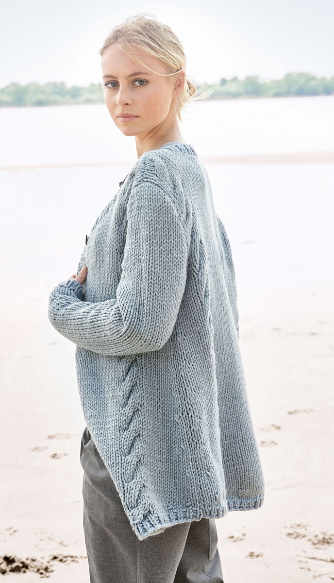 Lana Grossa Mille II (50% Schurwolle Merino extrafine, 50% Acryl, Lauflänge 55 m/50 g), 650 (700 – 750) g Graublau (Fb 96); Stricknadeln Nr. 7 und 5 Knöpfe von UNION KNOPF, Art. 452691, Fb 76, Gr. 24 mm