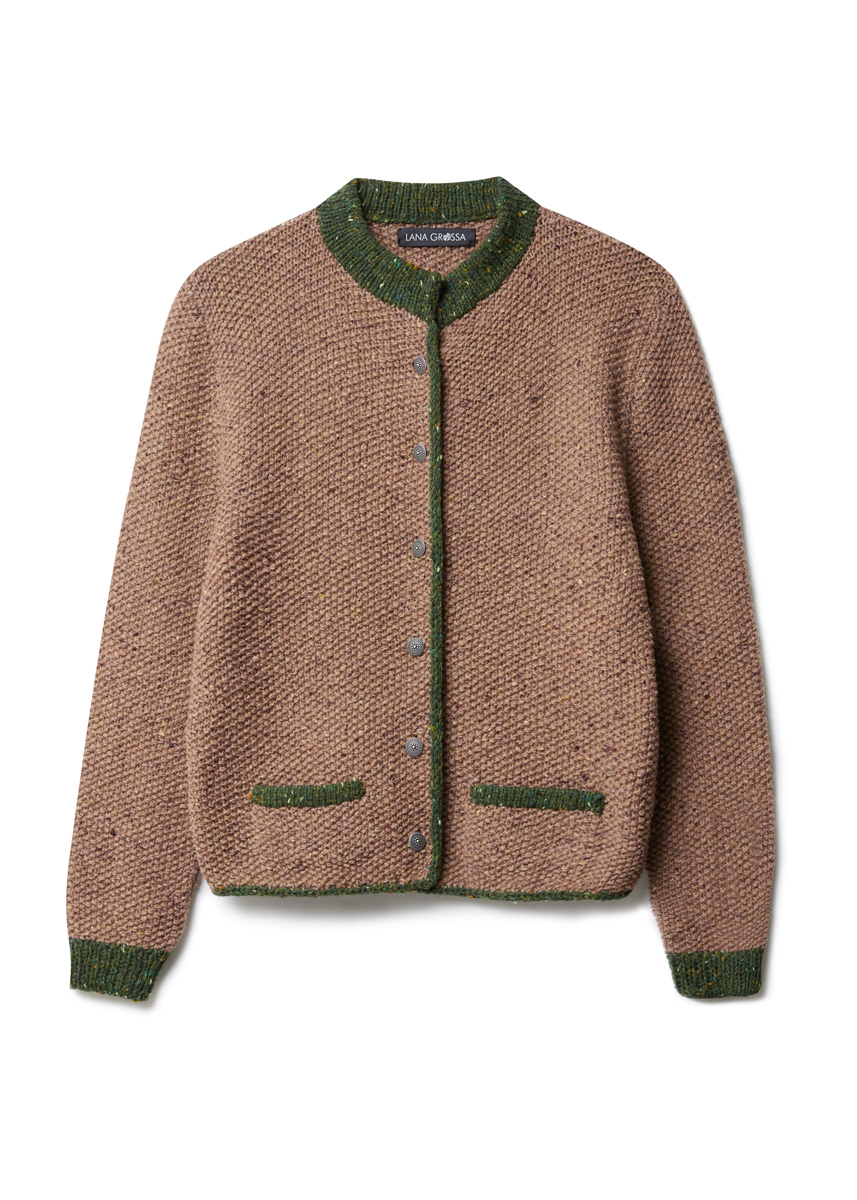 Lana Grossa Landlust Soft Tweed 180 (100% Schurwolle, Lauflänge 180 m/50 g), 300 (350 – 400 – 450) g Nougat meliert (Fb 109) und 50 g Dunkelgrün meliert (Fb 107); Stricknadeln Nr. 5 und je 1 Rundstricknadel Nr. 4,5, 40 und 100 cm lang, 6 Metalltrachten-Knöpfe von UNION KNOPF, Fb Silber, Ø 15 mm.
