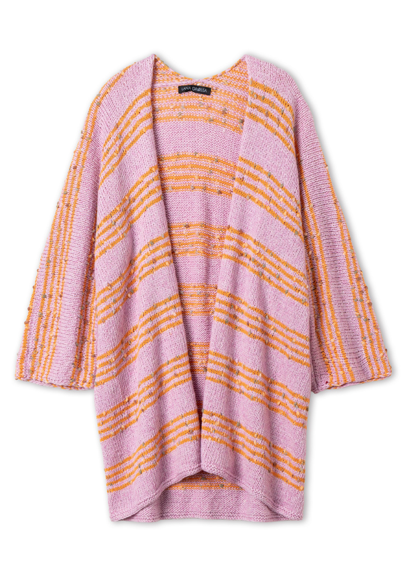 Lana Grossa-Qualität „Summer Softness“ (80 % Baumwolle (Bio), 20 % Schurwolle (Merino superfine), LL = ca 130 m/50 g): ca 400 (400 - 450 - 450) g Rosa (Fb 28); Lana Grossa-Qualität „Popcorn“ (100 % Baumwolle, LL = ca 125 m/50 g): ca 200 (200 - 250 - 250) g Mandarin/Rosa/Vanille/ Flieder (Fb 2); lange Rundstricknadel Nr 5.