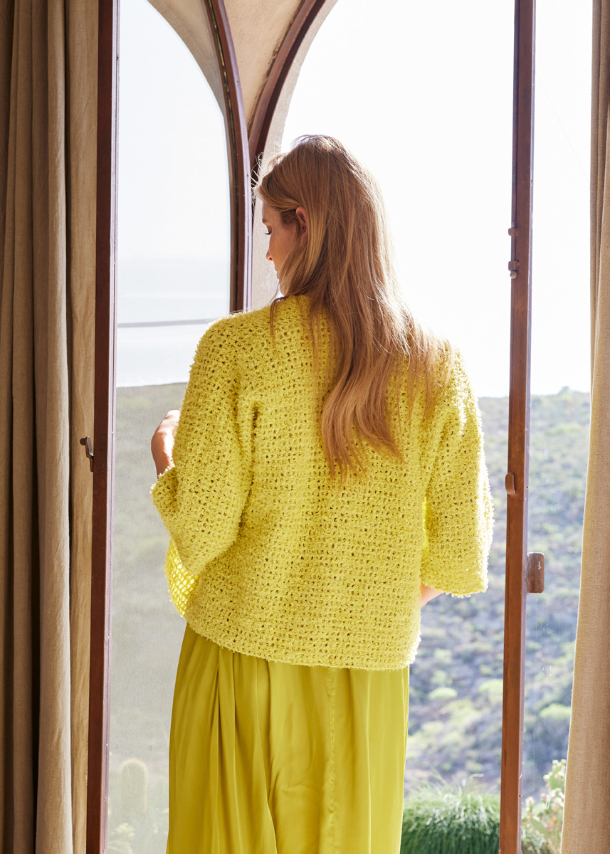 Frizzante – spritzig! – treffender kann man das angesagte Zitrusgelb und die lebhafte Textur unseres neuen Baumwollgarns nicht beschreiben! Die in einfachem Gittermuster gehäkelte Kimonojacke ist verschlusslos, kommt ohne aufwändige Ab- und Zunahmen aus und geht damit sowohl Einsteigern als auch Last-Minute-Buchern schnell von der Hand.
