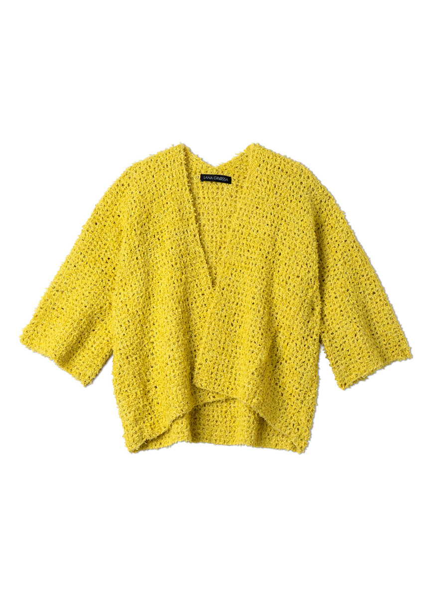 Lana Grossa Frizzante (54% Baumwolle, 46% Polyamid, LL = ca. 105 m/50 g), 400 (450 - 500 - 550) g in Zitrusgelb (Fb 10). 1 Häkelnd Nr. 3,5.