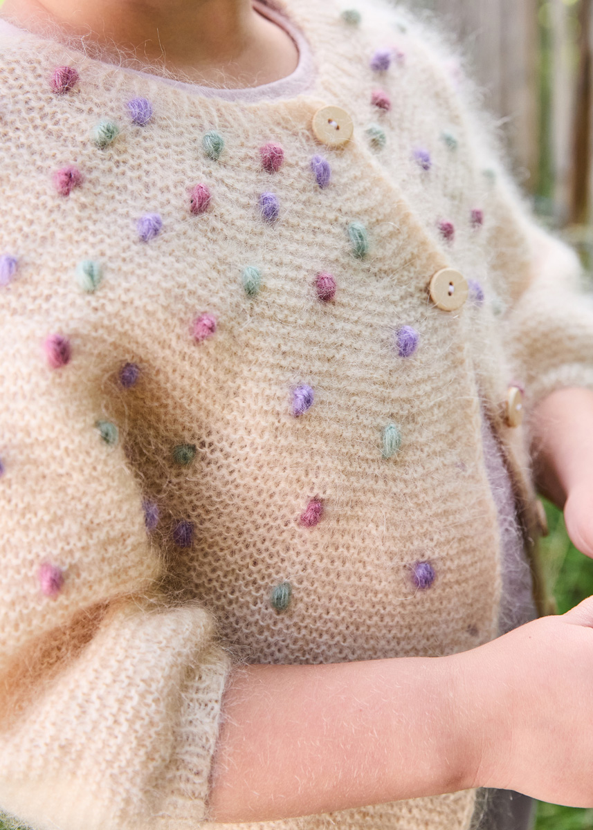 Lana Grossa-Qualität „Landlust-Kidmohair“ (70 % Mohair Superkid, 30 % Baumwolle, LL ca. 225 m/25 g), 150 g (150 g - 200 g) in Eierschale (Fb 2), je 25 g oder Reste in Mintgrün (Fb 6), in Graulila (Fb 13) und in Mauve (Fb 15); 1 Rundstricknadel Nr. 3,5, 80 cm lang, 1 Nadelspiel Nr. 3,5, 1 Häkelnadel Nr. 3,5, 12 Maschenmarkierer (MM), 6 Holzknöpfe, ø 15 mm.