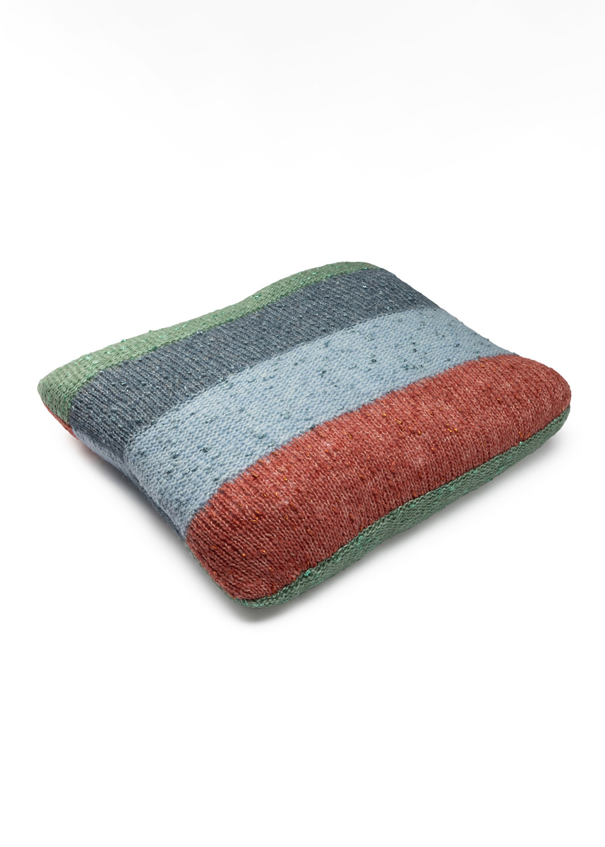 Lana Grossa-Qualität „Lucciola” (29 % Polyamid, 24 % Schurwolle (Merino Fine), 22 % Viskose, 20 % (Baby) Alpaka, 5 % metallische Faser, LL = ca. 130 m/50 g): je ca. 50 g Grün (Fb. 3), Graublau (Fb. 4), Hellblau (Fb. 5) und Terrakotta (Fb. 9); Stricknadeln Nr. 5; 1 waschbare Kissenfüllung, 45 x 45 cm.