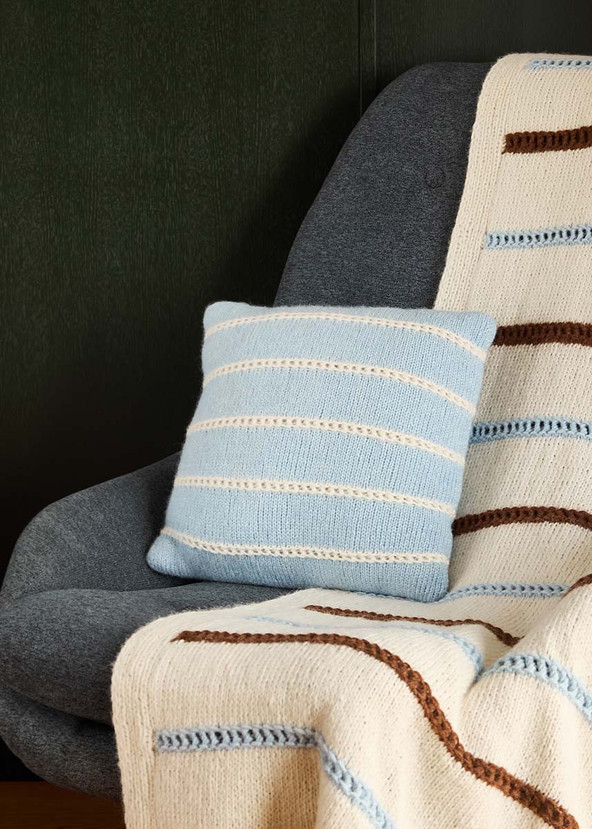Lana Grossa-Qualität „Brigitte No. 2” (47 % (Baby) Alpaka, 45 % Baumwolle, 8 % Schurwolle (Merino), LL = ca. 140 m/50 g): je ca. 200 g Schokobraun (Fb. 68) oder Lichtblau (Fb. 65) und je ca. 50 g Rohweiß (Fb. 16); Stricknadeln Nr. 4; 1 waschbare Kissenfüllunge, je 40 x 40 cm.