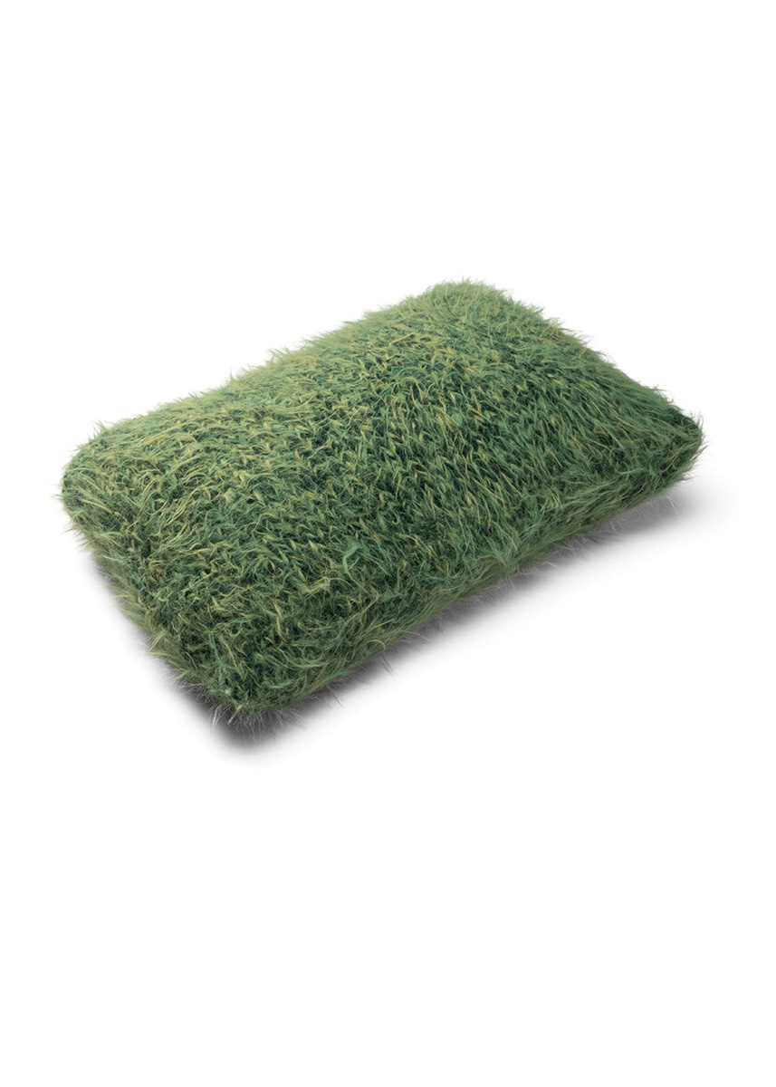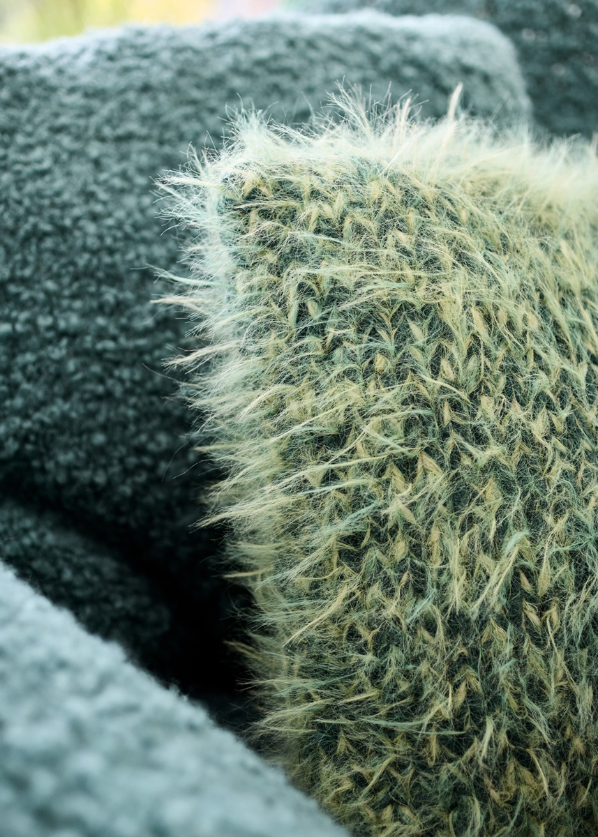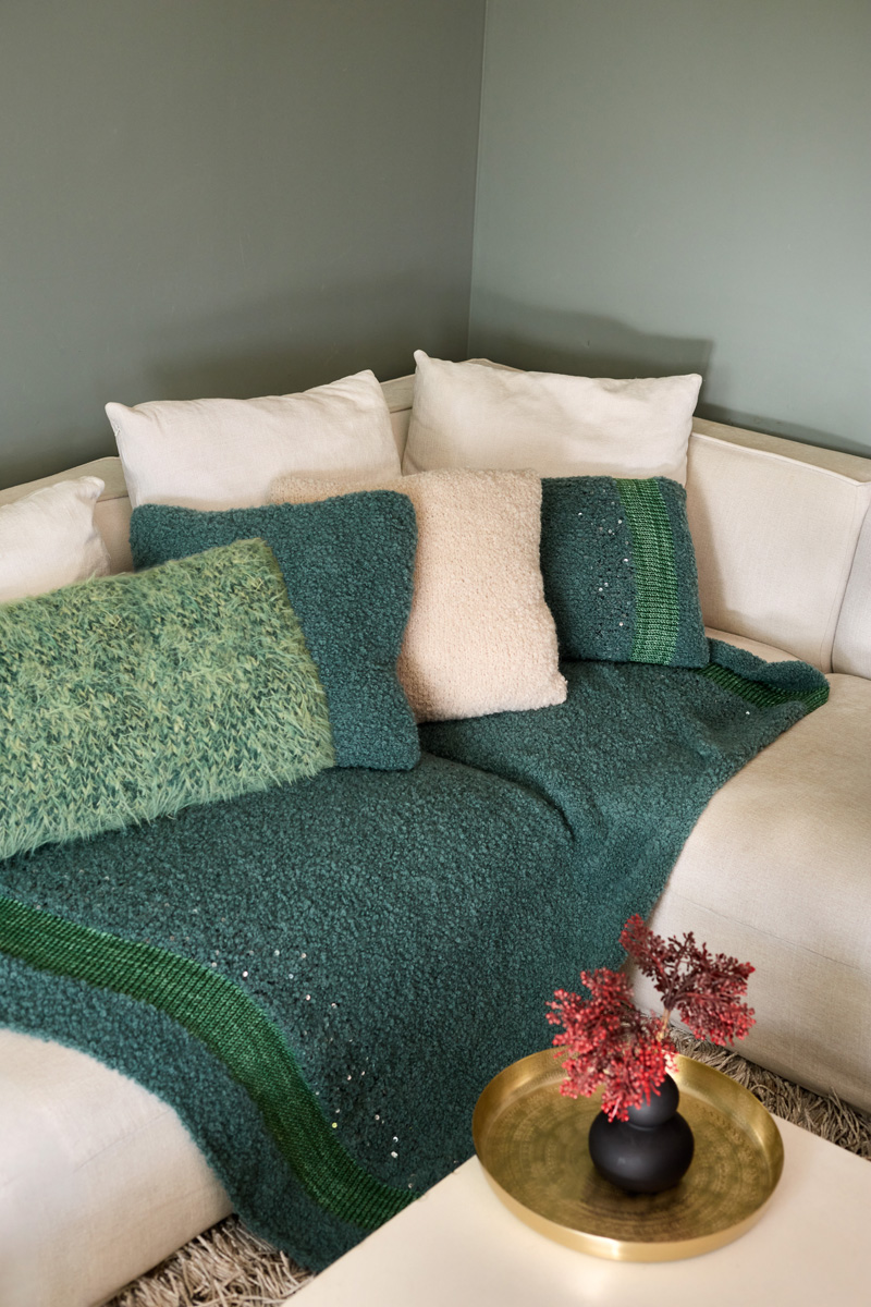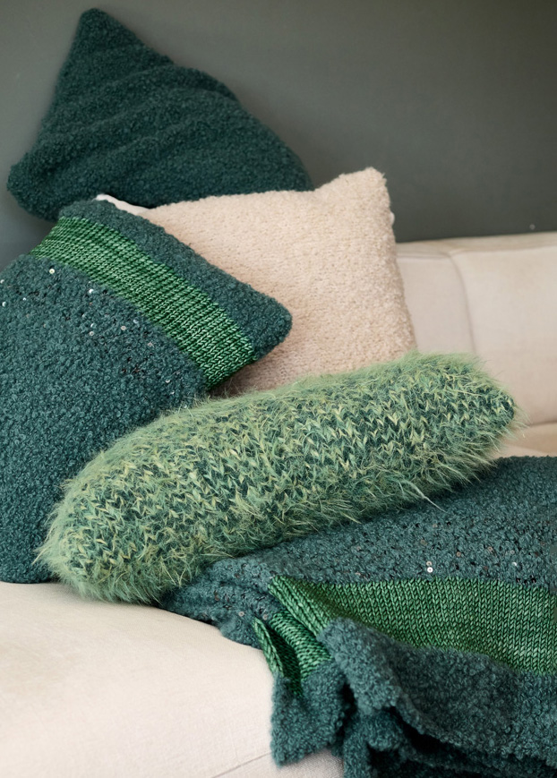 Lana Grossa-Qualität „The Look” (100 % Polyester, LL = ca. 120 m/100 g): ca. 300 g Waldgrün (Fb. 29) und Lana Grossa-Qualität „Basta” (50 % Schurwolle (Merino), 50 % Polyamid, LL = ca. 100 m/50 g): je ca. 150 g Lindgrün (Fb. 15) und Resedagrün (Fb. 29); Stricknadeln Nr. 10; 1 waschbare Kissenfüllung, 40 x 60 cm.