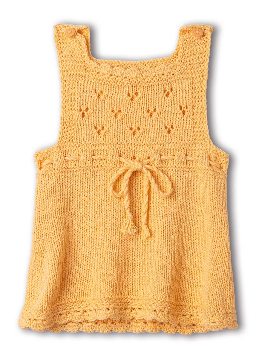 Lana Grossa Campo (65% Baumwolle, 25% Viskose, 10% Leinen; LL = 165 m/50 g): 100 (100/150/150) g Sonnengelb (Fb. 13); eine Rundstricknadel 3,5 mm; eine Häkelnadel 3 mm; 2 Markierer; 2 Knöpfe mit 13 mm Ø.
