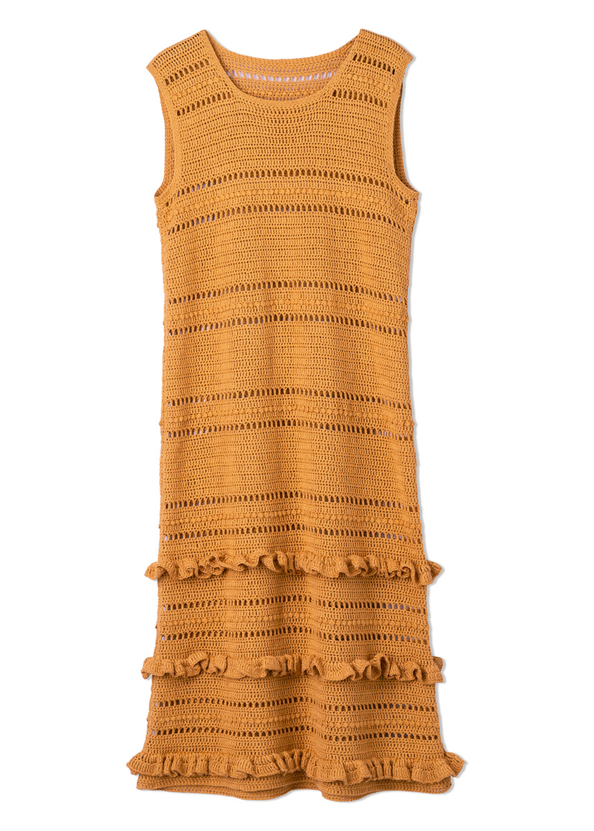 Perfect Match: Aufgehäkelte Rüschen bringen Allure ins Midi-Dress aus Stäbchen und Büschelmaschen. Dazu gibt es die passende Micro-Bag – beides aus CAMPO.