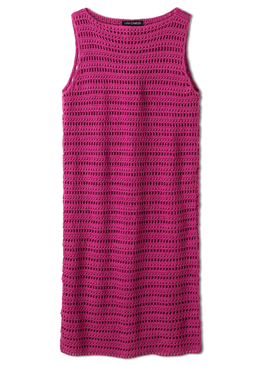 Lana Grossa-Qualität „Landlust Baumwolle” (100 % (Bio) Baumwolle, LL = ca. 115 m/50 g): ca. 650 (700) g Fuchsia (Fb. 18); 1 Wollhäkelnadel Nr. 3,5.