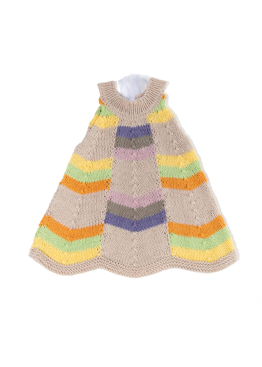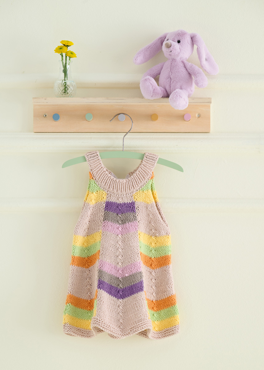 Lana Grossa Soft Cotton (70% Baumwolle, 30% Polyacryl; LL = 140 m/50 g): 50 (100/100/100) g Beige (Fb. 3) und je 50 g Rosa (Fb. 6), Graubeige (Fb. 4), Anthrazitviolett (Fb. 53), Gelb (Fb. 11), Orange (Fb. 59) und Lindgrün (Fb. 36); je eine Rundstricknadel 3 mm und 3,5 mm; entfernbare Maschenmarkierer (alternativ Sicherheitsnadeln); 80 cm Organzaband, 2,5 cm breit.